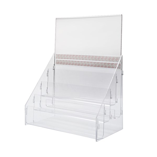 Kraftig holder med fire rum i etager til brochurer og blanketter.