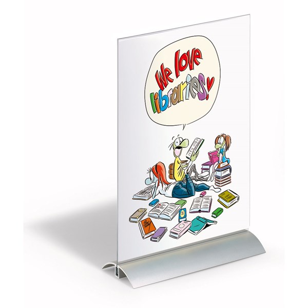 Eksklusiv dobbeltsidet skilteholder til bord, skranke, hylde, vinduer m.m.