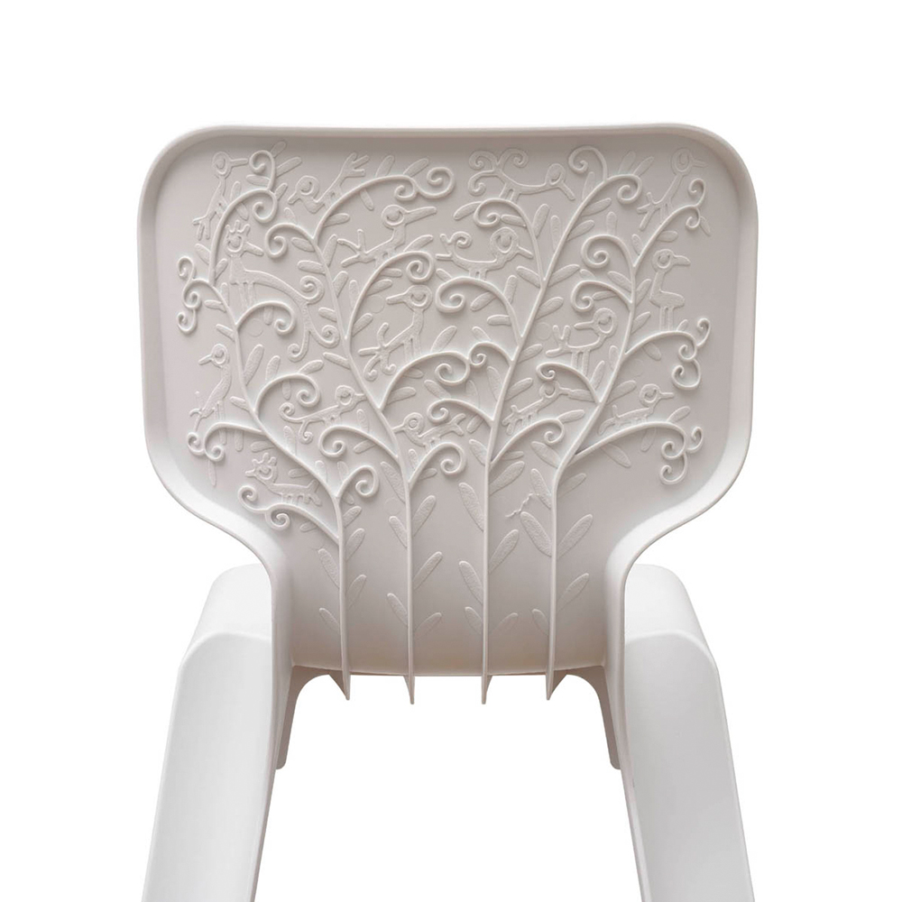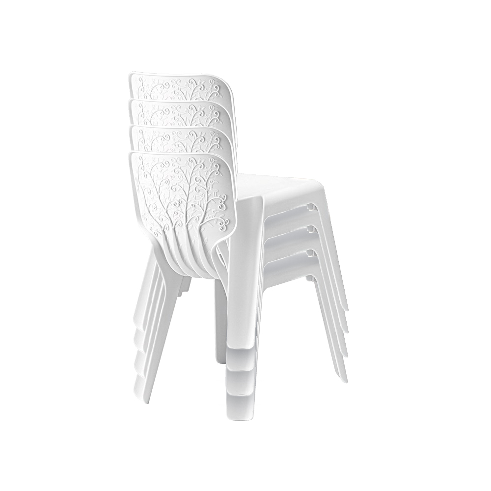 En let, stabelbar stol, hvis sjæl findes i dens udformning. Ryggen er fyldt med grenornamenter med små fugle her og der.
