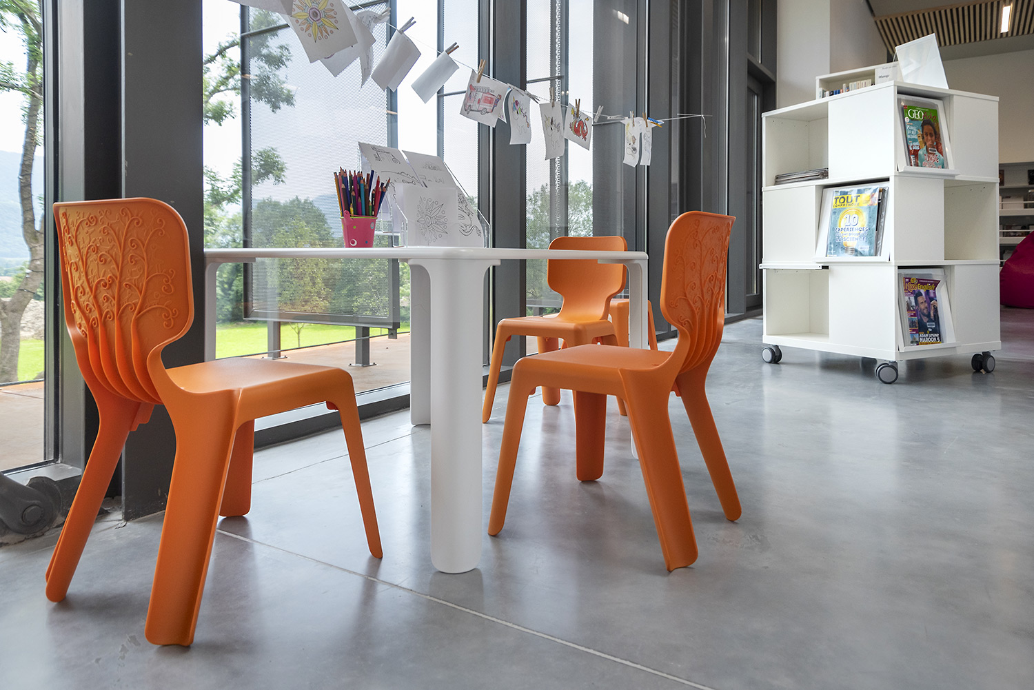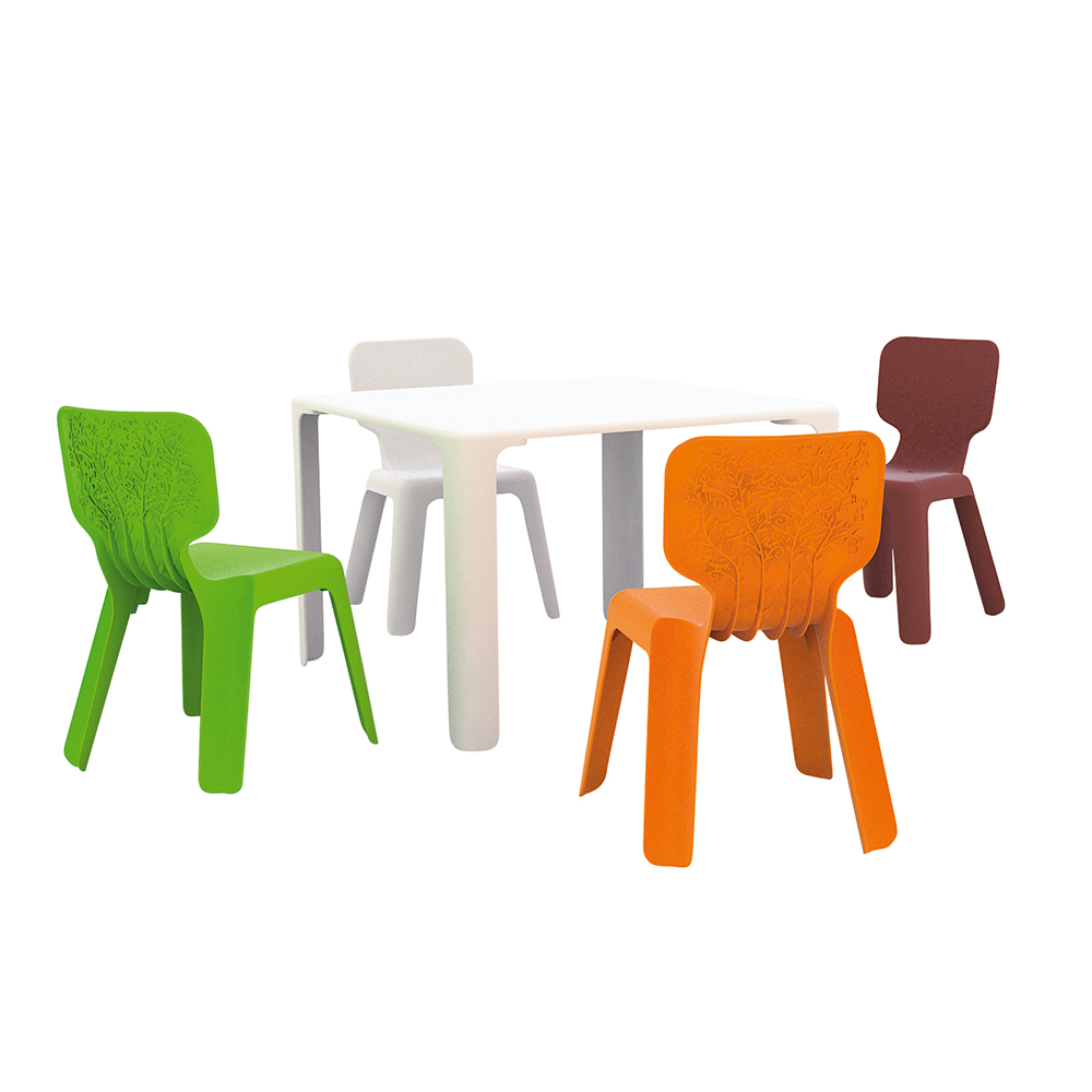Idé og funktion i skøn forening. Udover at give stolen stabilitet er det med til at give stolen et kreativt og muntert udseende. Farverne repræsenterer de forskellige årstider: grønt for foråret, orange for sommeren, brunt for efteråret samt hvidt for vinteren.
