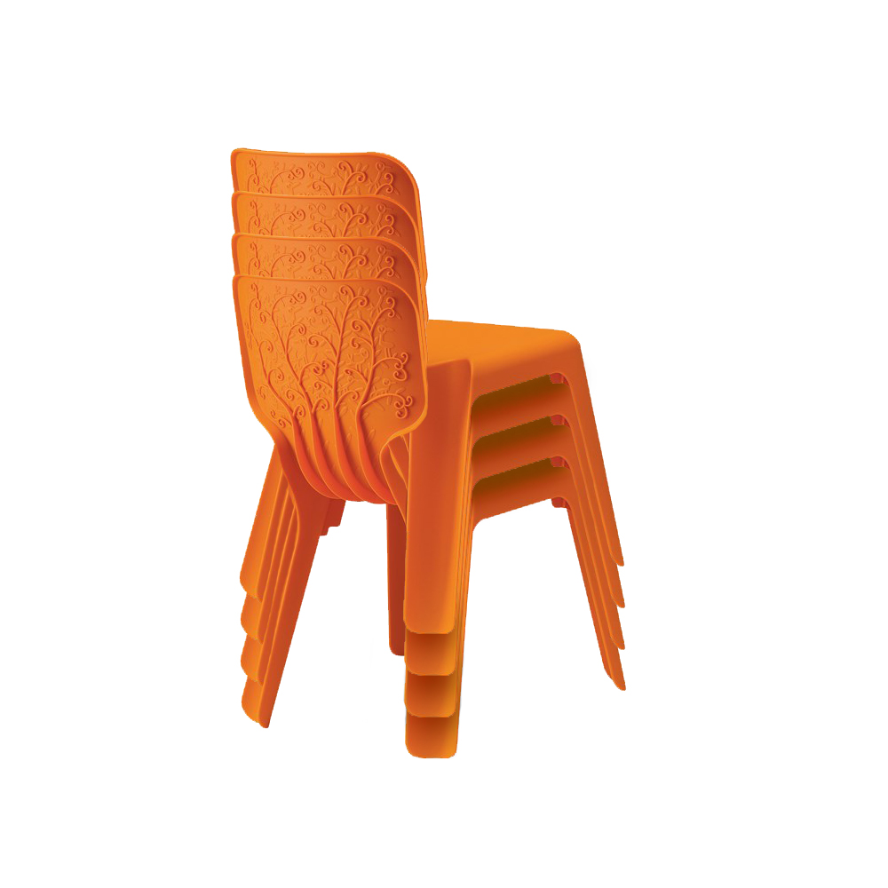 En let, stabelbar stol, hvis sjæl findes i dens udformning. Ryggen er fyldt med grenornamenter med små fugle her og der.