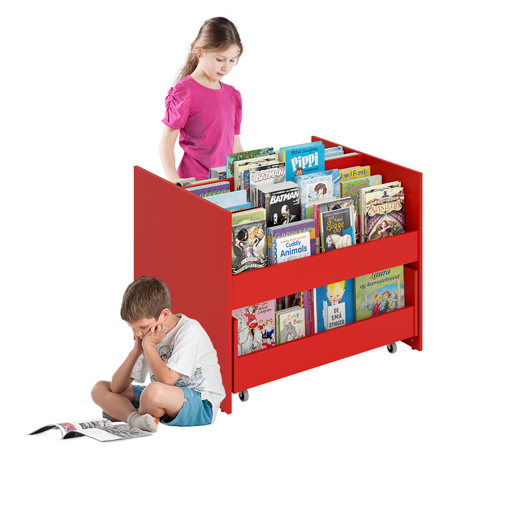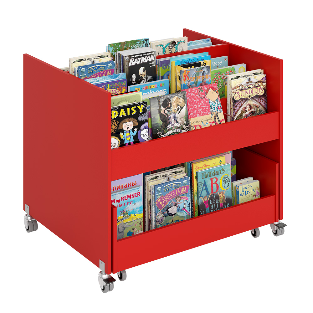 Populær, dobbeltsidet billedbogskrybbe i 3 etager med 2 flytbare rumdelere og udtræks-skuffer med 2 rum og hjul nederst på begge sider.