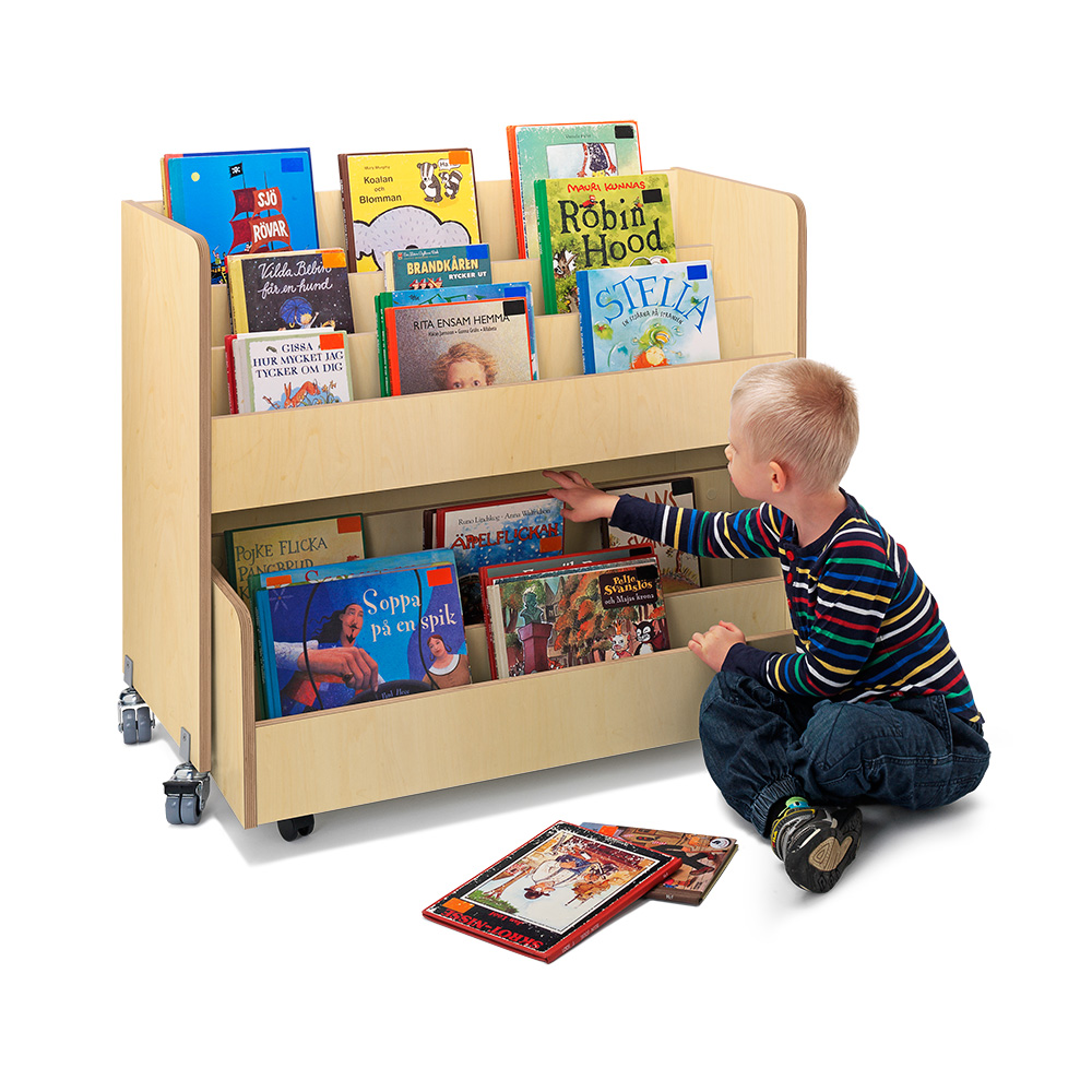 Populær billedbogskrybbe i 3 etager med 2 flytbare rumdelere og udtræks-skuffe med 2 rum og hjul nederst.