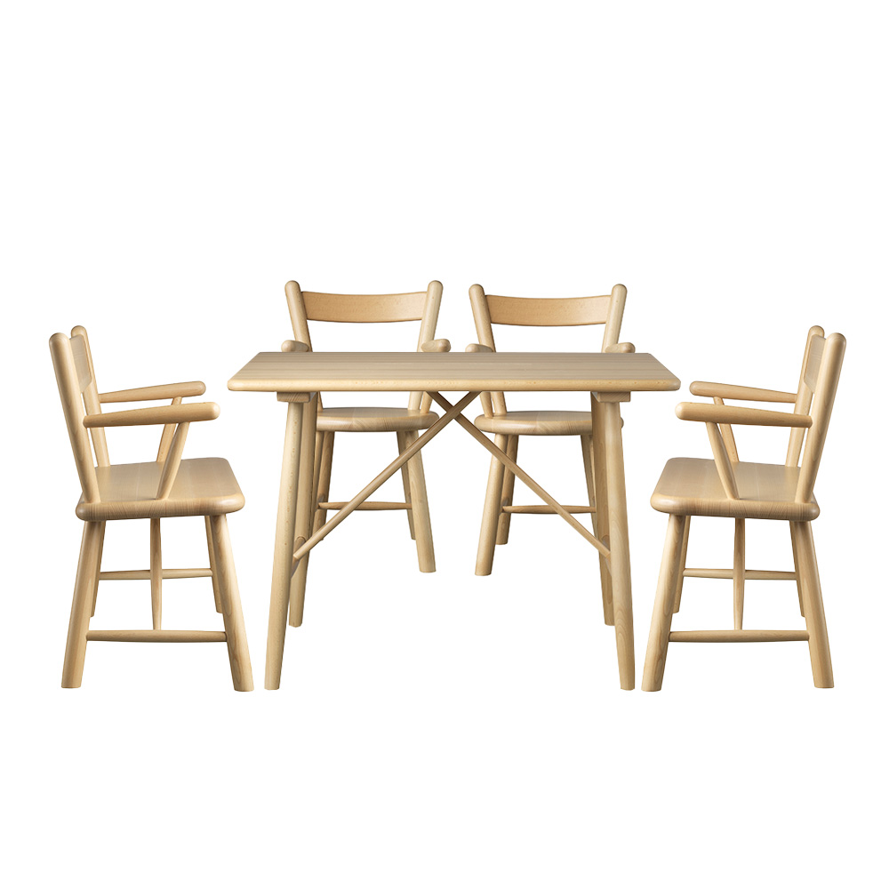 Møblerne er fremstillet af lakeret bøg og kræver minimal vedligeholdelse. De kan nemt rengøres ved blot at tørre af med en fugtig klud.