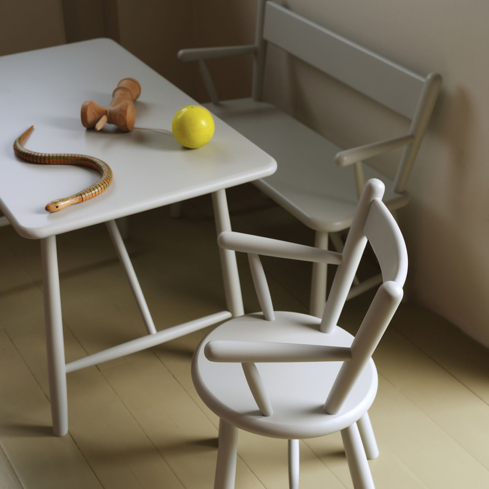 Møblerne er fremstillet af lakeret bøg og kræver minimal vedligeholdelse. De kan nemt rengøres ved blot at tørre af med en fugtig klud.
