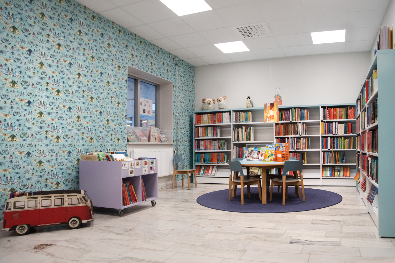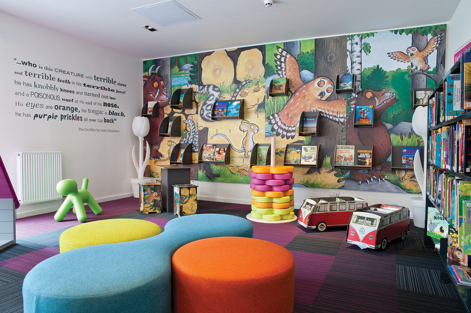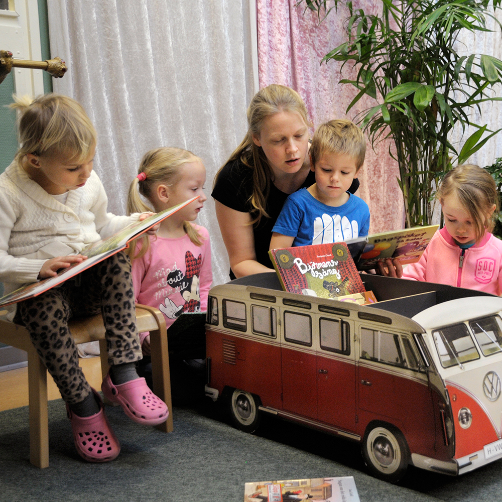 Sjov billedbogskrybbe i mindre format med 3 rum.