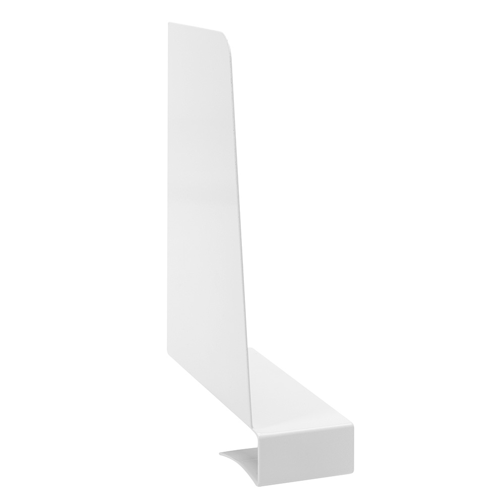 Bogstøtte som påsættes træhyldeforkanten.