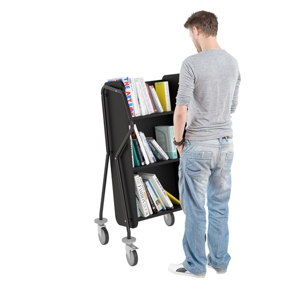 Ergonomisk, brugervenlig, enkeltsidet bogvogn med 3 hylder. Rigelig afstand mellem hylderne sikrer, at vognen også passer til bøger i større format.