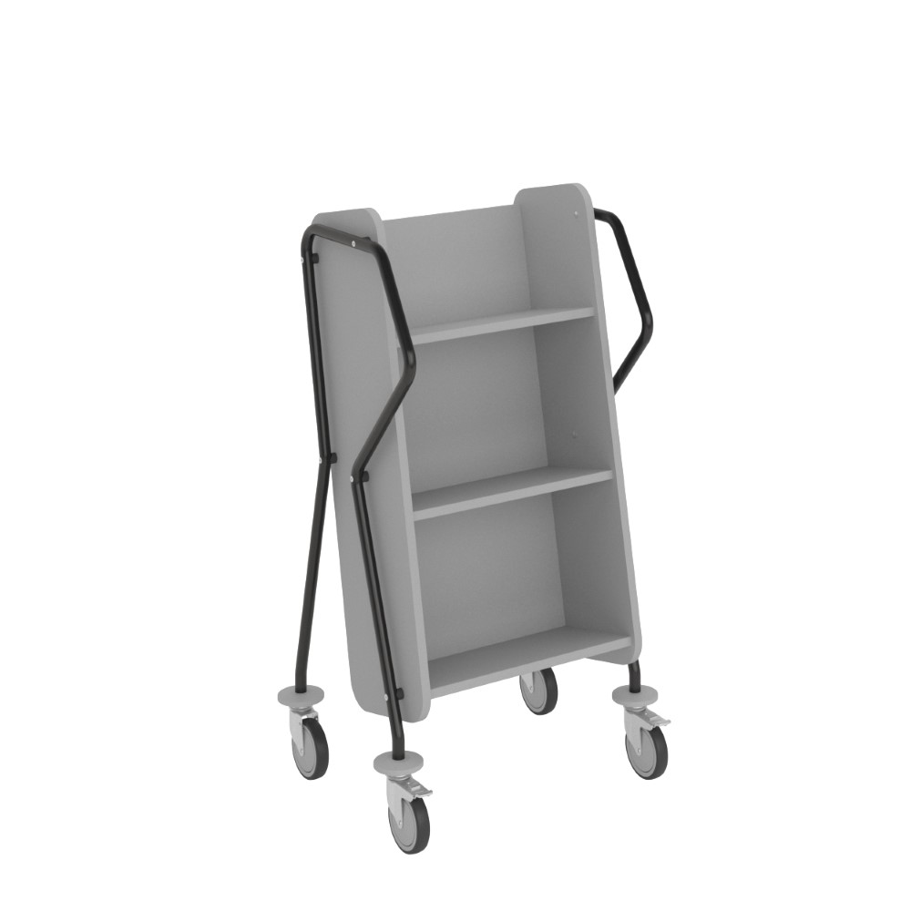 Ergonomisk, brugervenlig, enkeltsidet bogvogn med 3 hylder. Rigelig afstand mellem hylderne sikrer, at vognen også passer til bøger i større format.