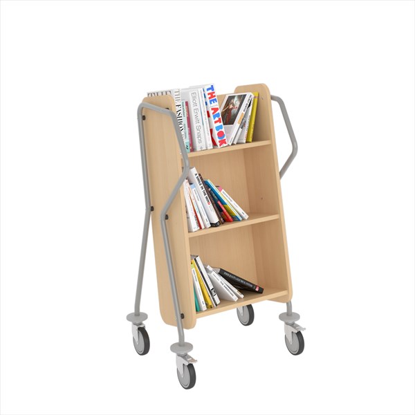 Ergonomisk, brugervenlig, enkeltsidet bogvogn med 3 hylder. Rigelig afstand mellem hylderne sikrer, at vognen også passer til bøger i større format.