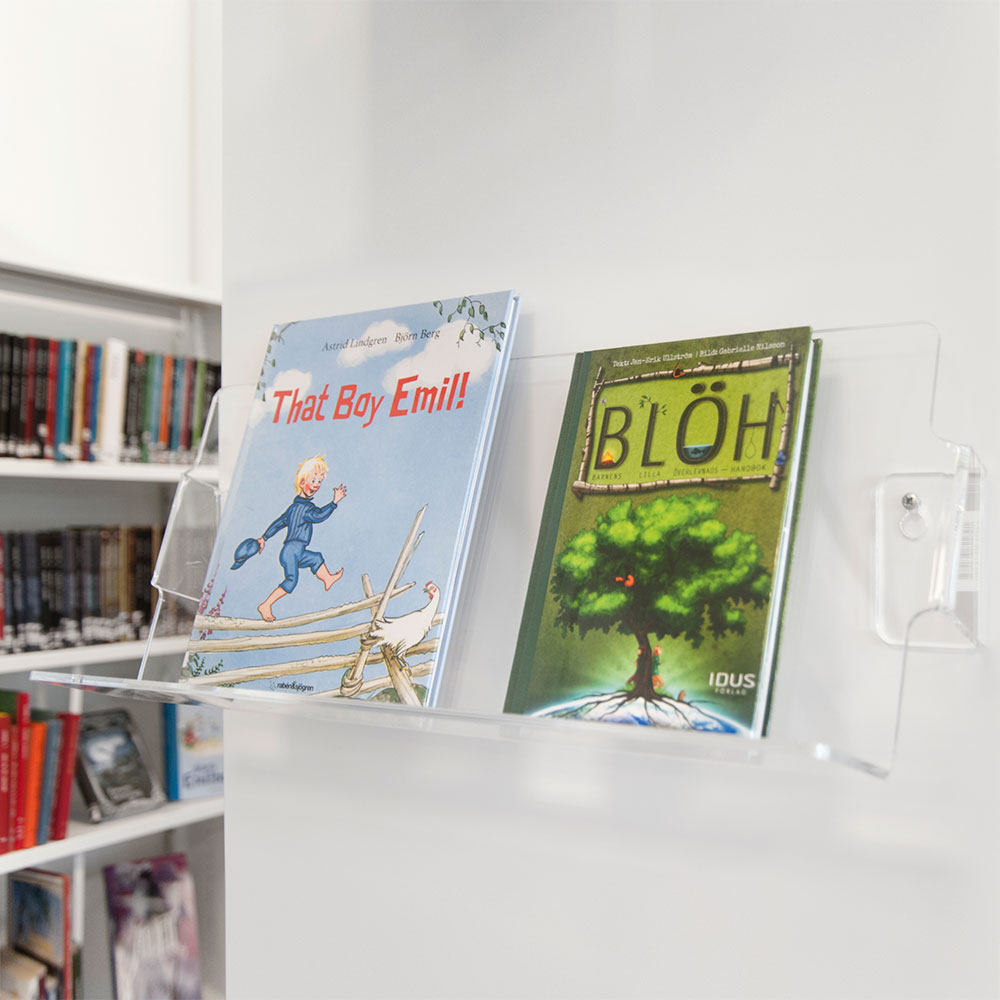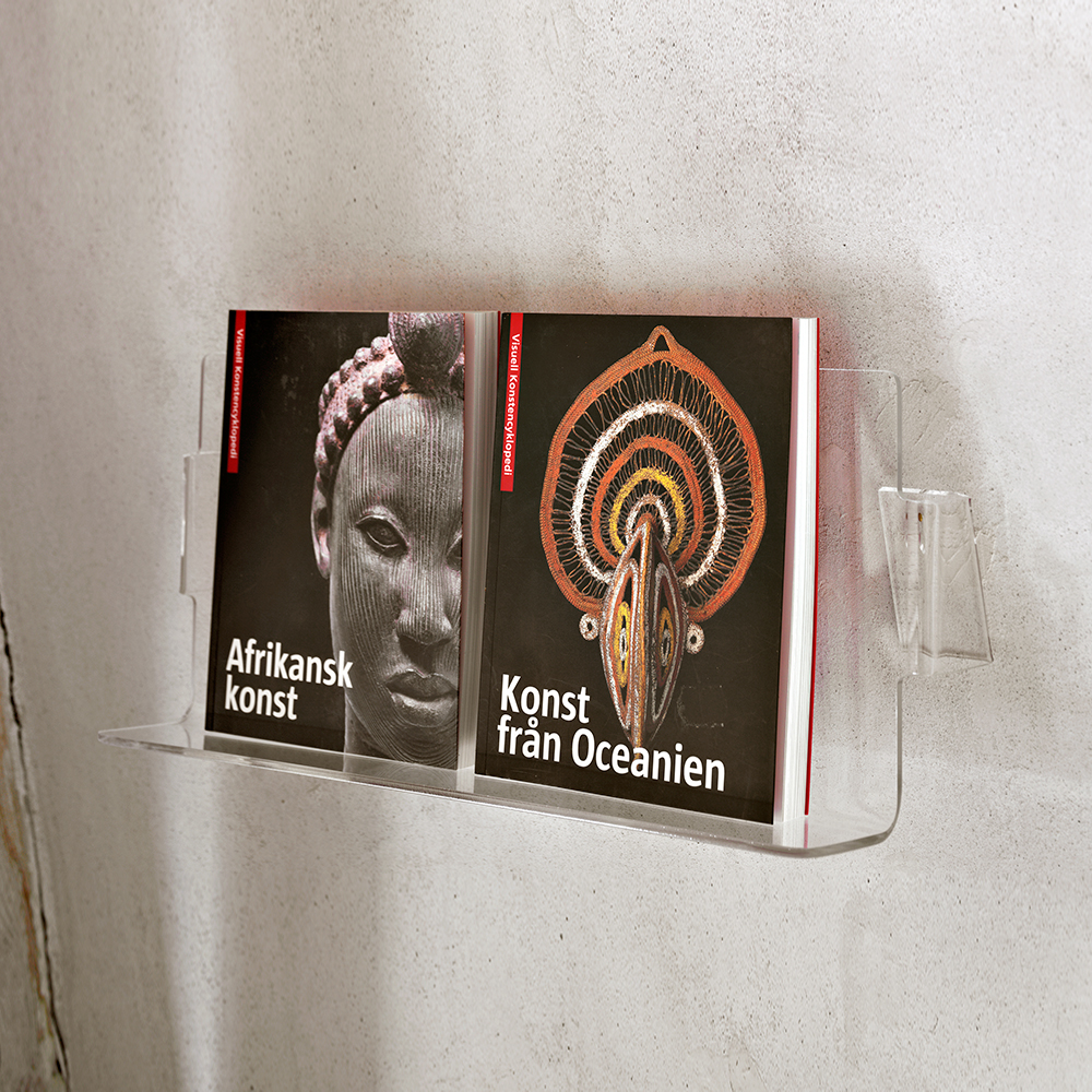 Flot, væghængt udstillingshylde i kraftig akryl med flot detaljefinish.