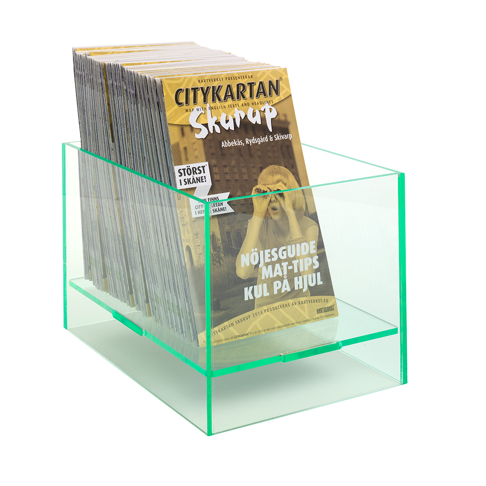 Én boks, to anvendelsesmuligheder – brug den med åbningen opad og fyld den med forskellige temaprodukter eller give-aways, eller vend den om og brug den som udstilingspodie til display af brochurer, bøger m.m.
