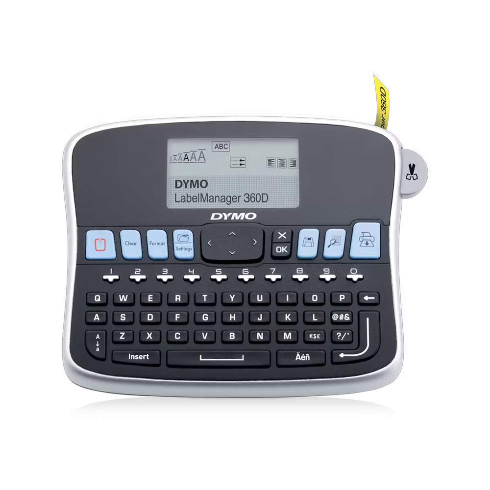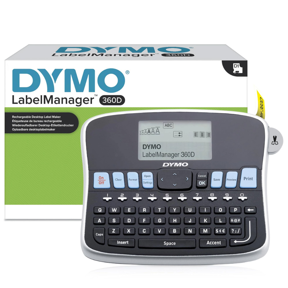 Dymo 360D kan anvendes med mærkningstape type D1 i 6, 9, 12 og 19 mm. Større skærm og endnu flere muligheder.