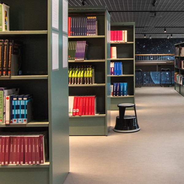 Taburet med hjul som skubbes op når taburetten belastes. Taburetten står absolut stabilt på gulvet.