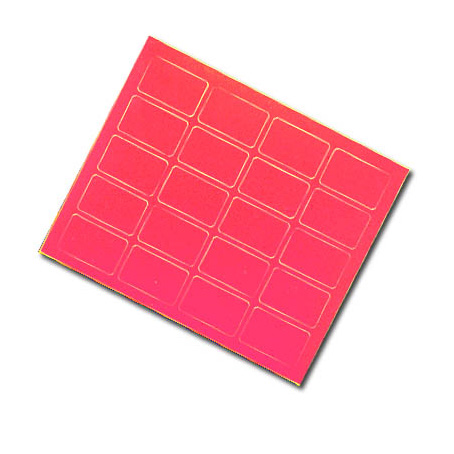 Selvklæbende, udstansede farvemarkeringer i ark til mærkning af bøger og lignende med trykt eller påskrevet tekst.