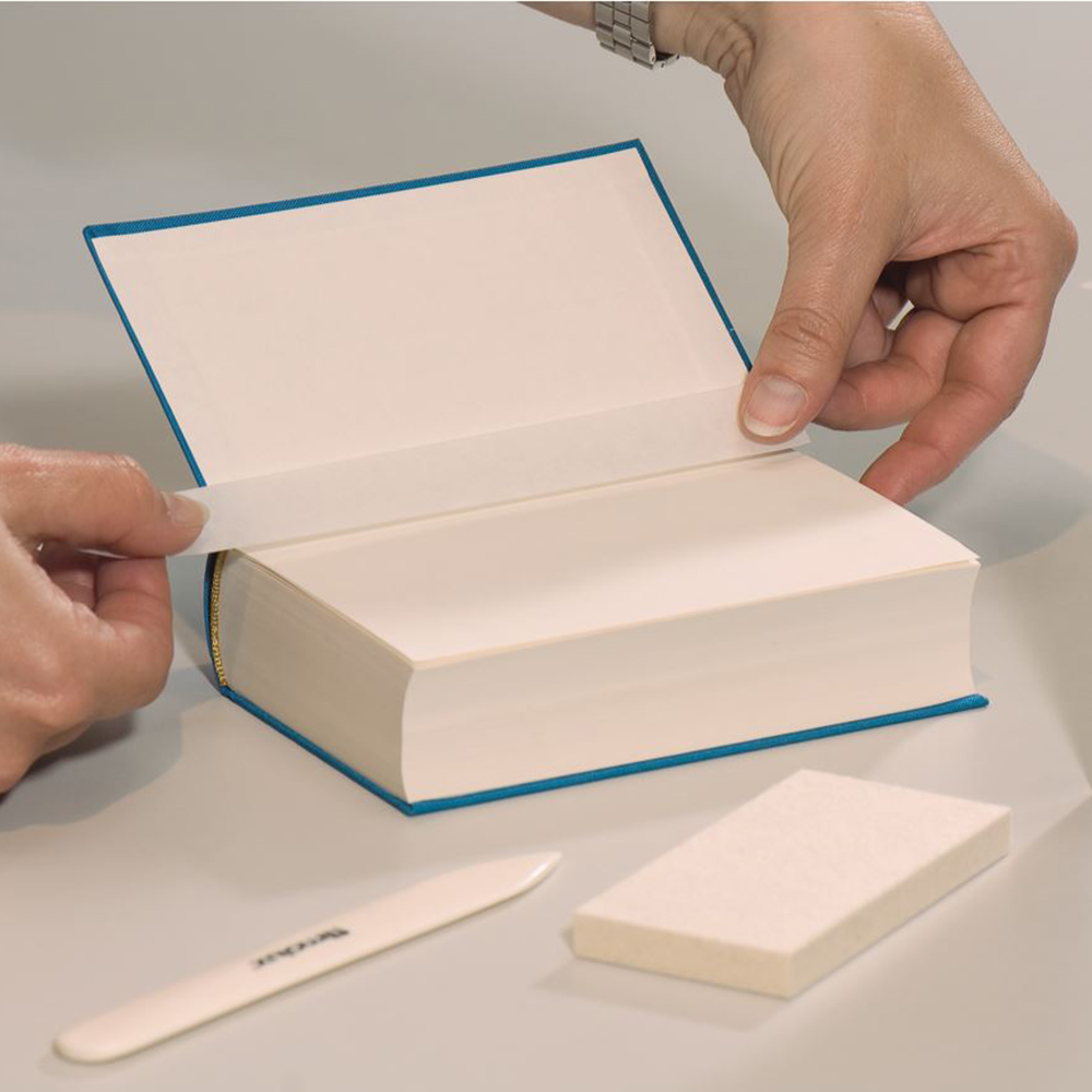 Ideel til at forstærke samlinger mellem bogomslag og bogsider. Høj hæfteevne og stor styrke; rives ikke let i stykker. Papiret er næsten usynligt og meget fleksibelt, perfekt til at lime i folder. God til fiksering af billeder, fotografier og grafik i passepartout eller bagstykke. Giver støvfri tætning af bagstykker.