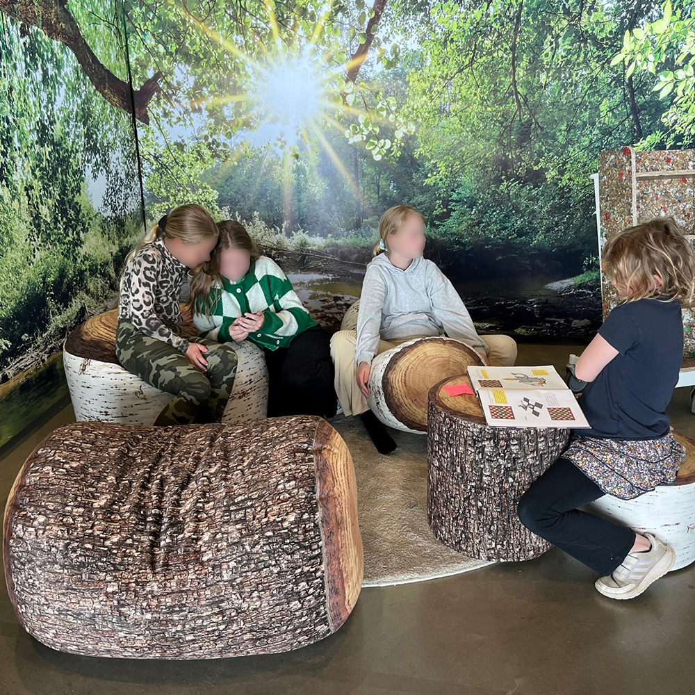 De iøjnefaldende, faste, men alligevel komfortable og stabile Floki Tree puffer har en slående lighed med en ægte træstub. De fås i 2 højder til både børn og voksne.