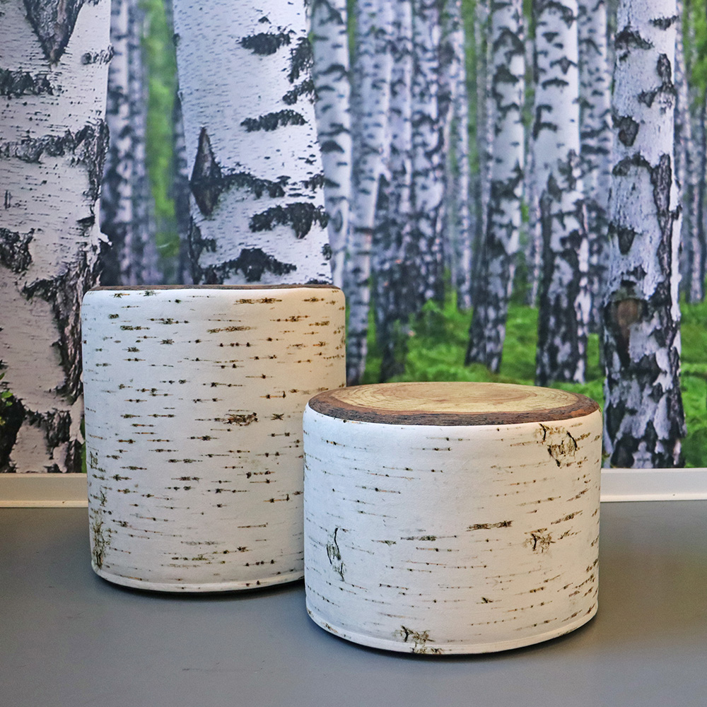 De iøjnefaldende, faste, men alligevel komfortable og stabile Floki Tree puffer har en slående lighed med en ægte træstub. De fås i 2 højder til både børn og voksne.