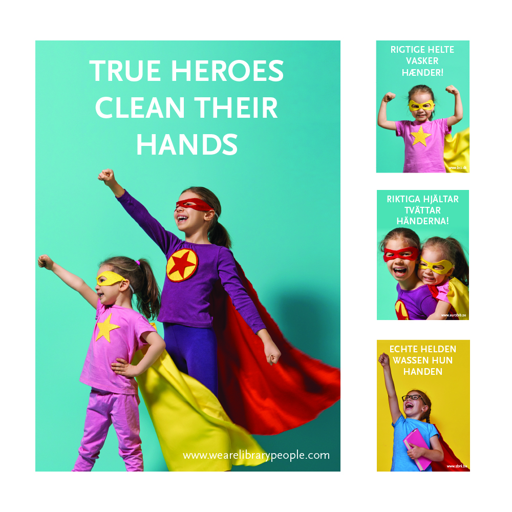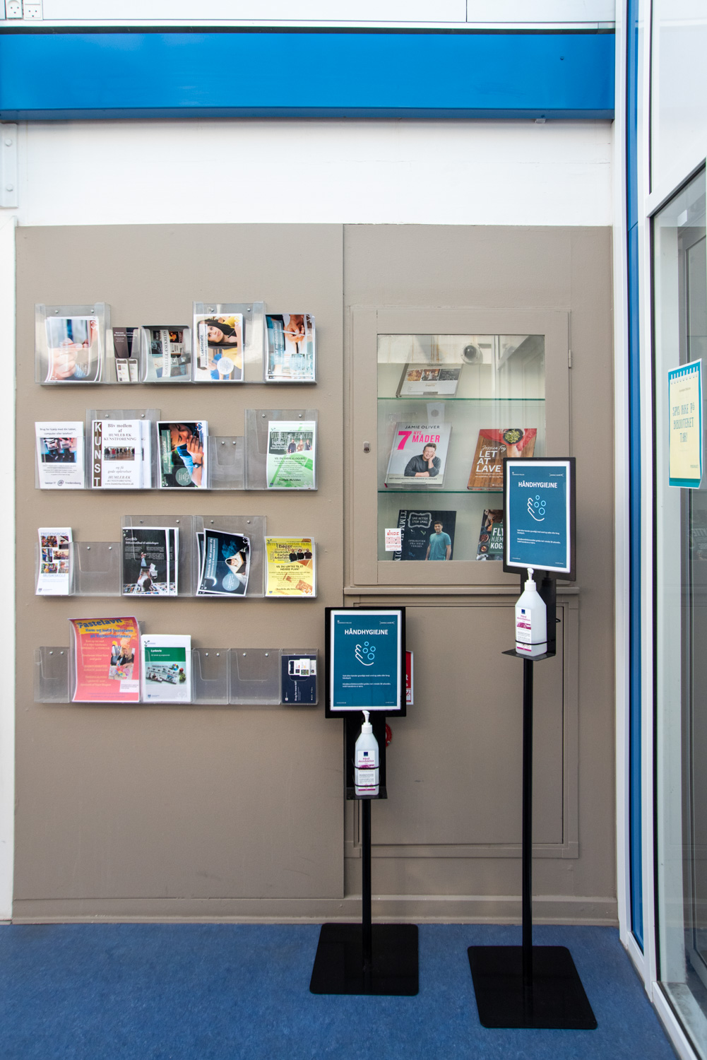 Stil standeren i indgangspartier, afleveringszoner, ved informationsskranken og søgestationer for at sikre god hygiejne overalt i biblioteket.