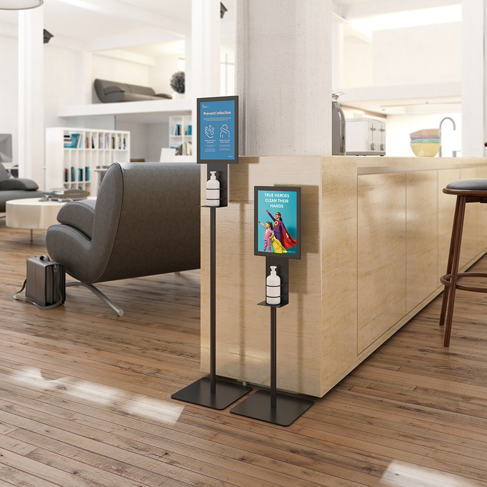 Stabil fritstående gulvstander til hånddesinfektion med A4 magnetramme til nem udskiftning af information.
