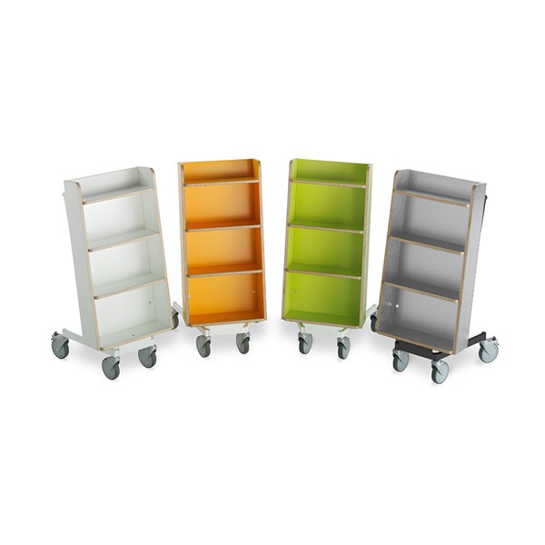 Praktisk, enkeltsidet bogvogn med 4 hylder. De to midterste hylder er flytbare til forskellige mediestørrelser.