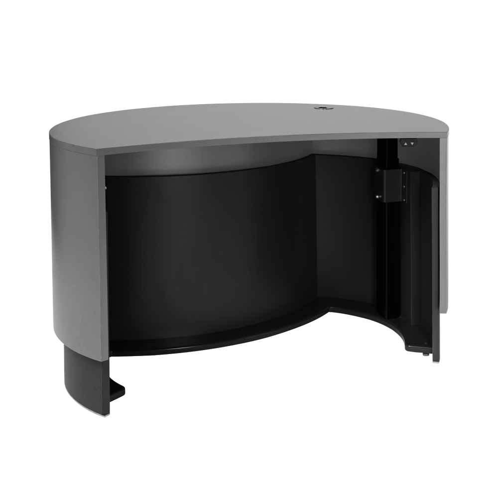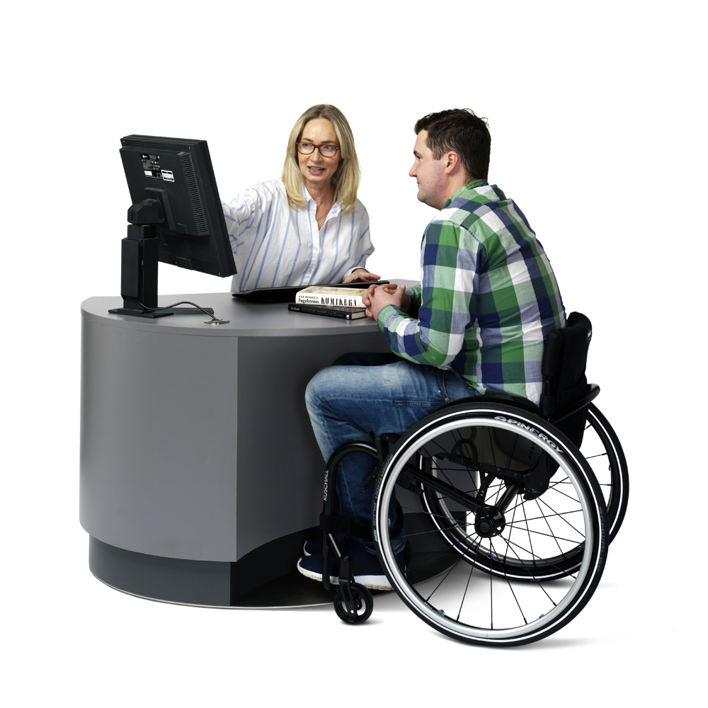 Kan indstilles i højden (elektrisk) for god ergonomi, og den tilbagetrukne front gør den let tilgængelig og inviterer besøgende til at komme nærmere også i en kørestol (lav position) eller med en rollator (høj position).