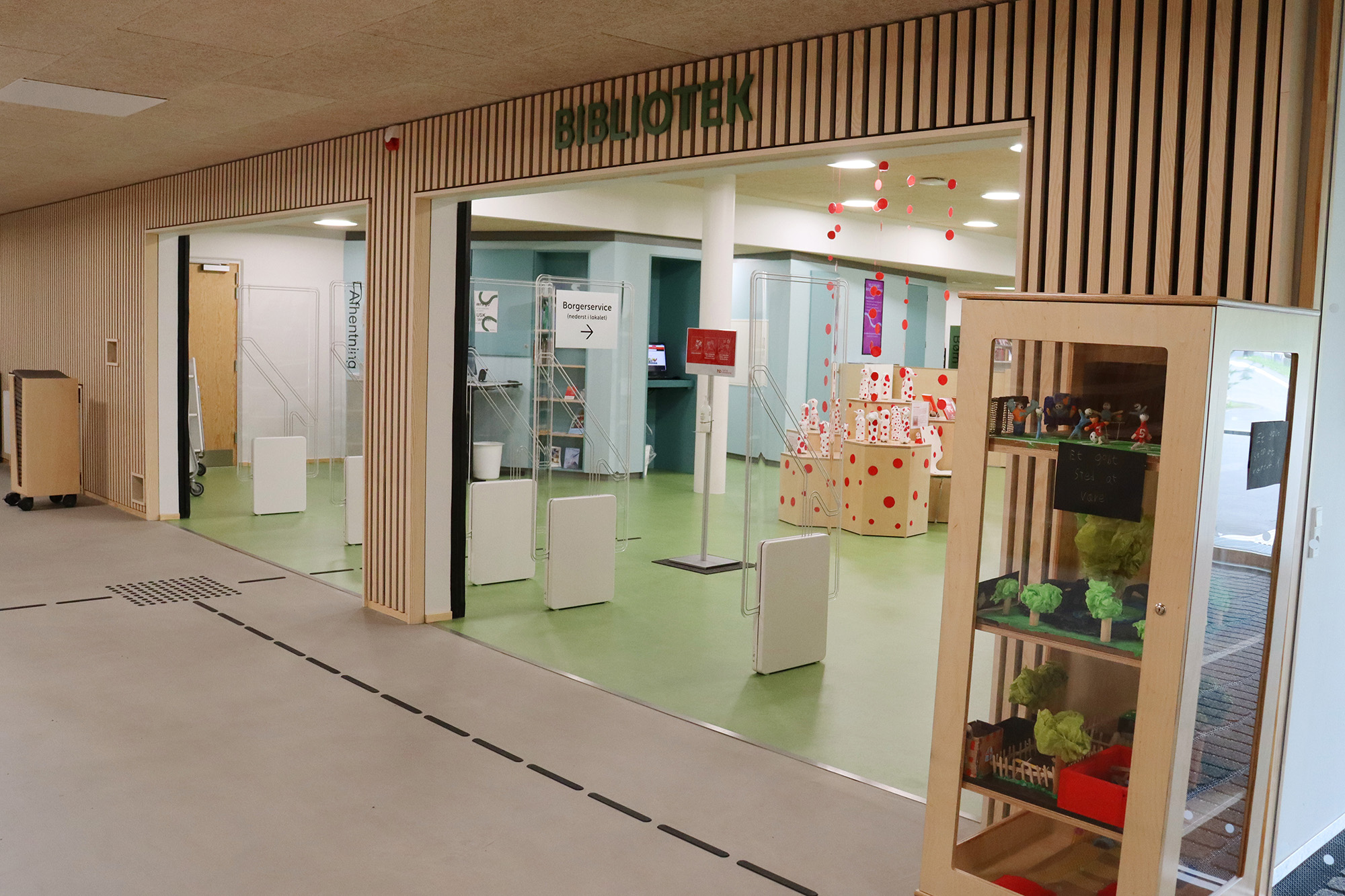 Lige indenfor hovedindgangen til det nye byggeri findes biblioteket, der bliver betegnet som rødderne under det nye kulturhus. Biblioteket er offentligt og rummer også et lokale til Borgerservice. Biblioteket anvendes i dagligdagen af både voksne, ældre, børn og familier – og selvfølgelig af de skoleklasser og institutioner, der er en del af Børne- og Kulturhuset.