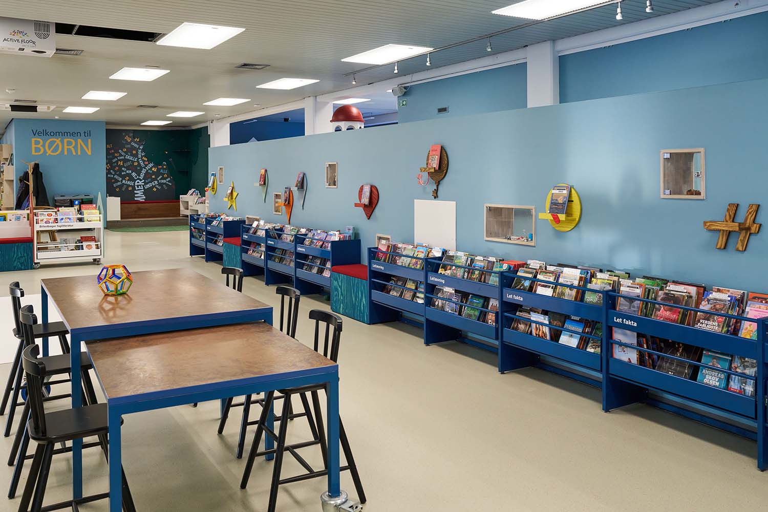 Børneområdet fylder i dag en væsentlig del af biblioteket – både fysisk og oplevelsesmæssigt. Her er der skabt et større, mere helstøbt område, hvor et langbord fungerer som naturligt samlingspunkt for leg, fordybelse og fælles aktiviteter.