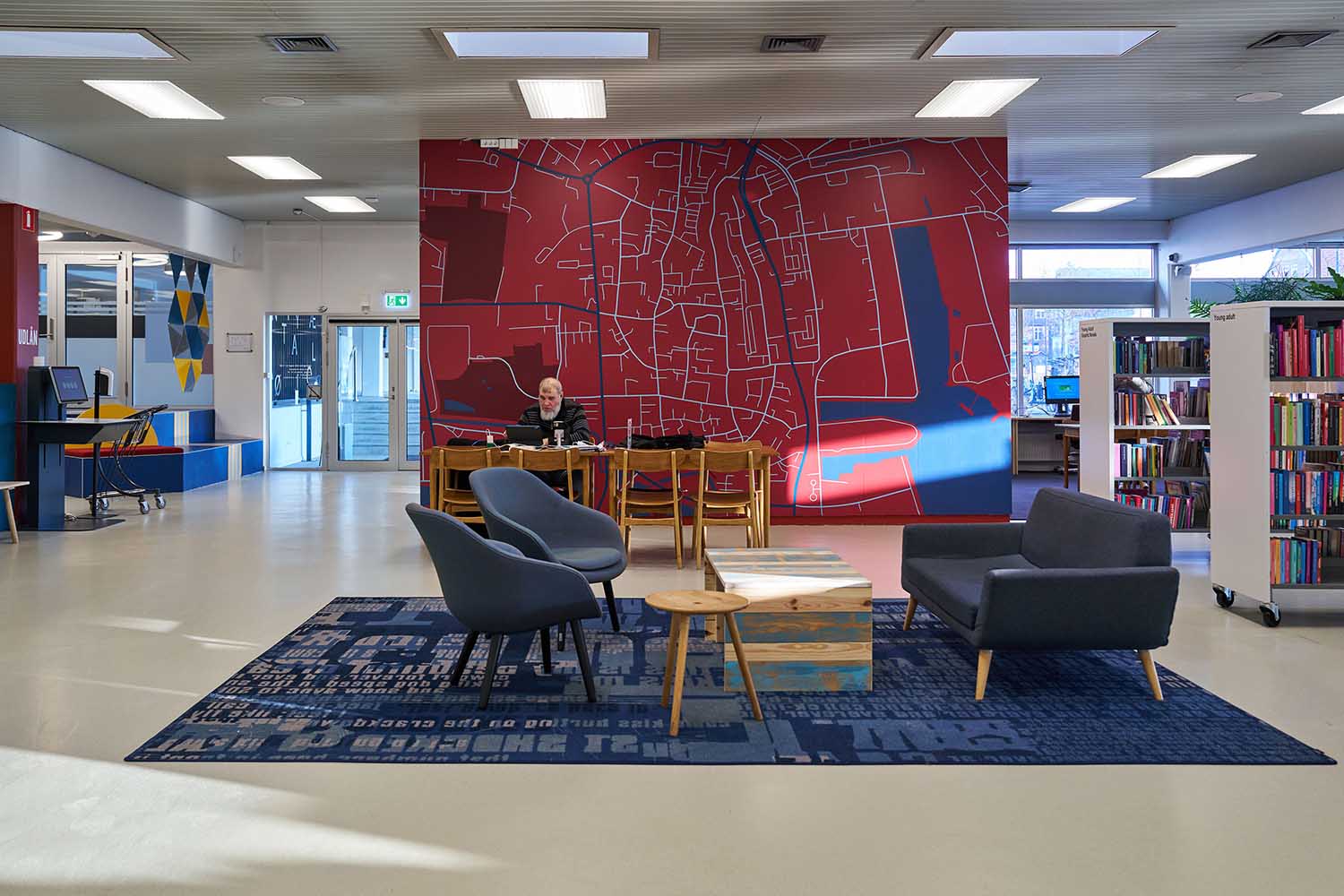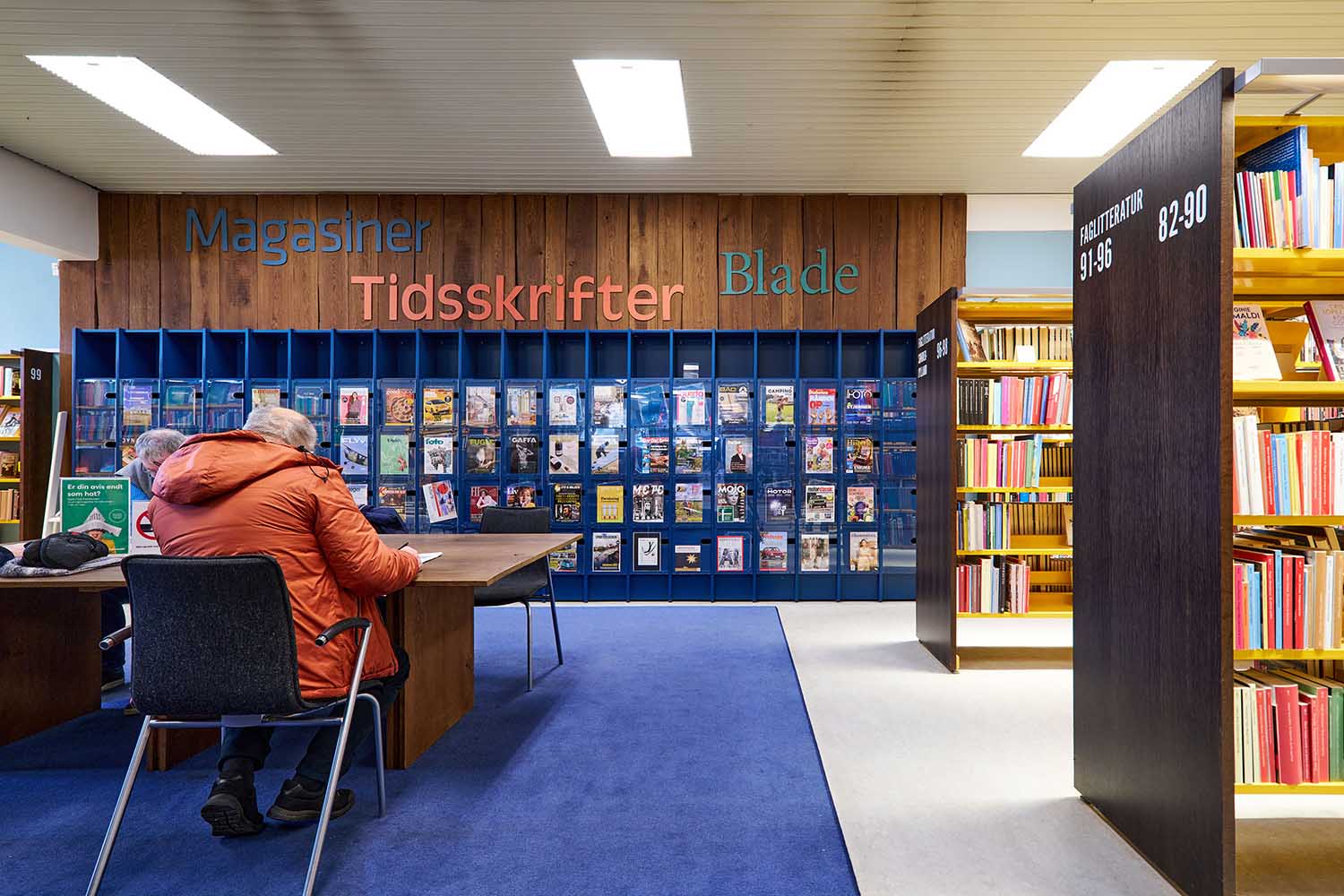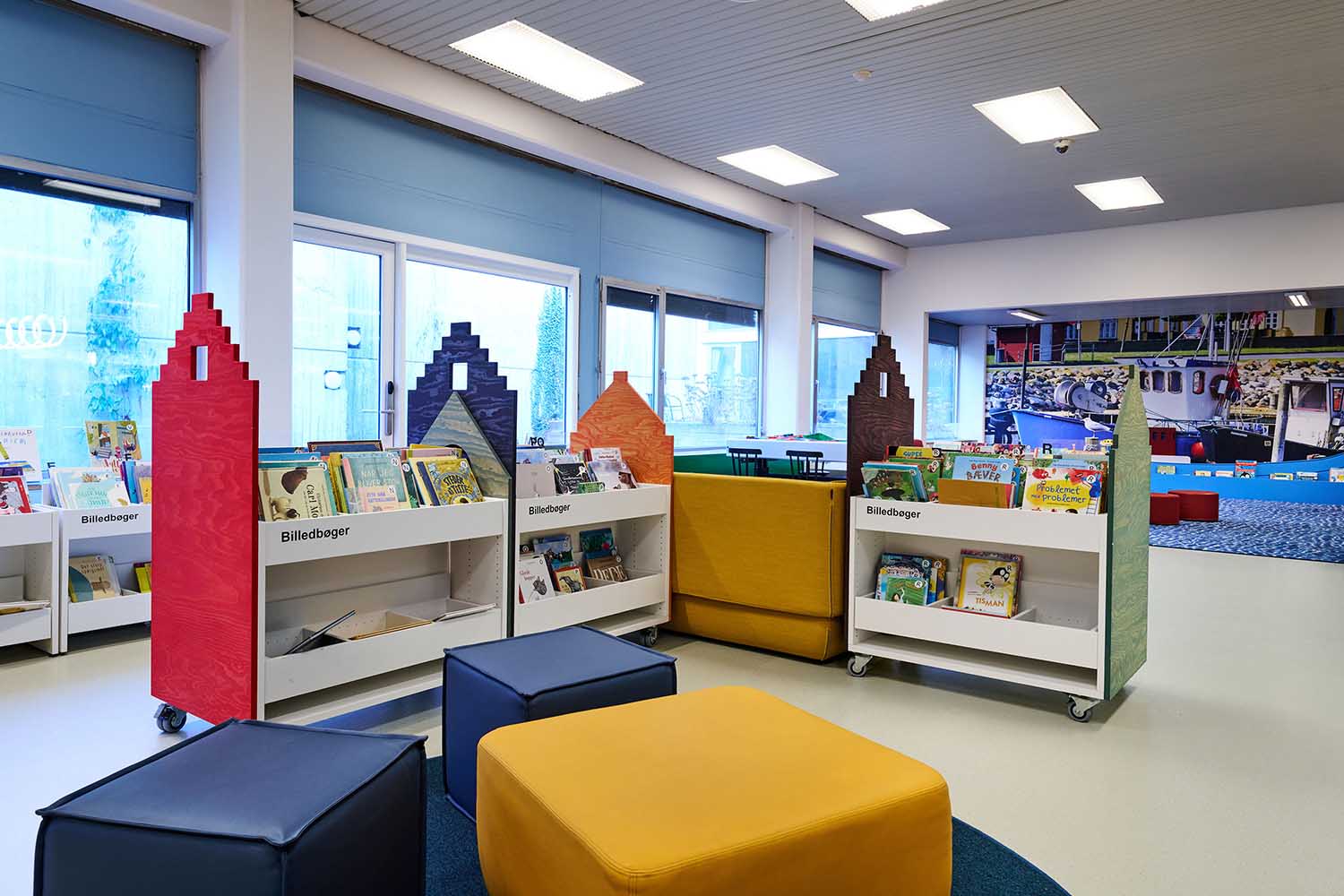 En af de spændende udfordringer har været at skabe afgrænsede zoner i det store ét-rumsbibliotek. Løsningen er blevet en indretning med små “rum i rummet”, hvor man intuitivt kan aflæse, hvem området henvender sig til. Børneområdet er lavt, åbent og farverigt, mens voksenområdet er kendetegnet ved højere reoler og en mere rolig struktur.
