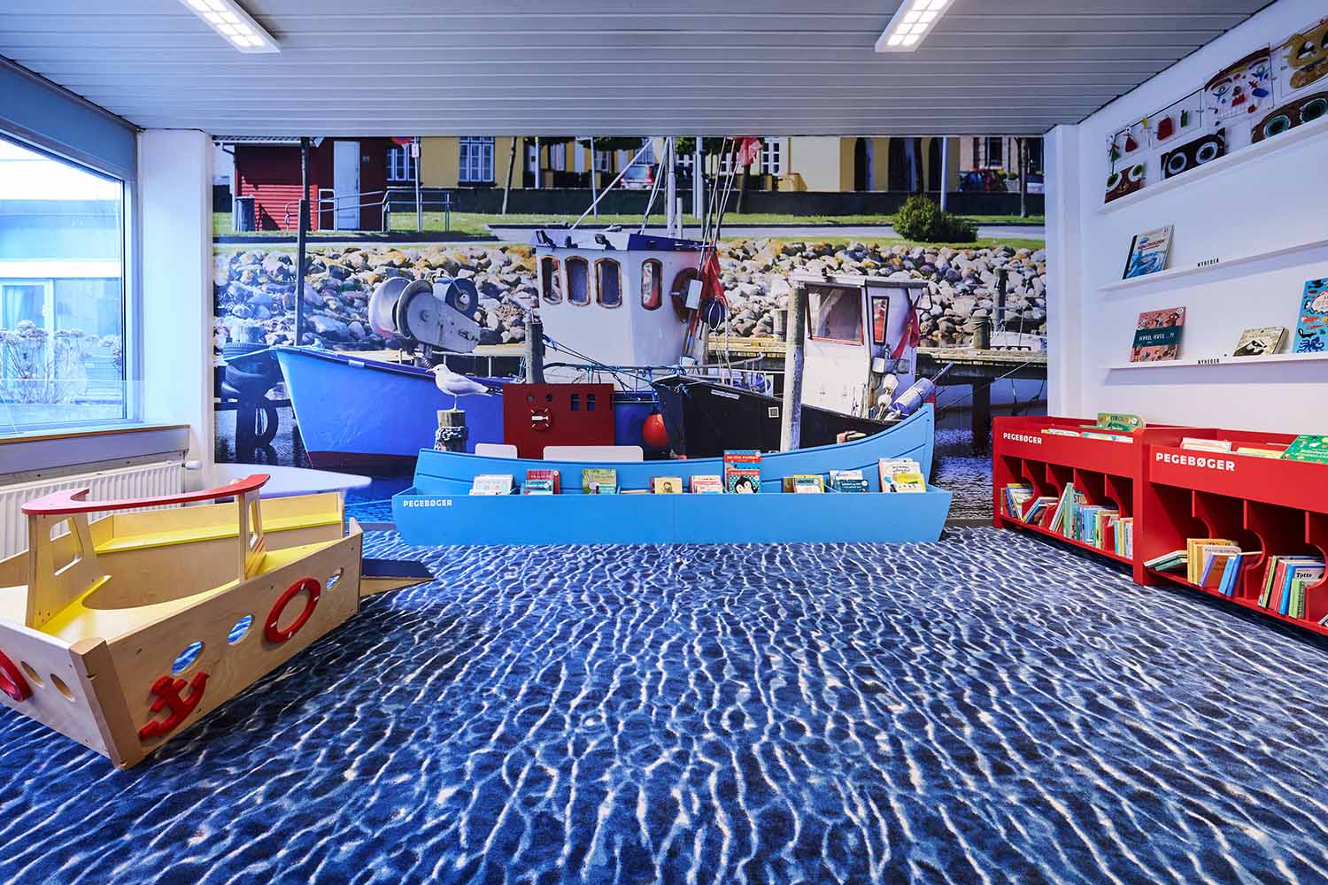 Ved indgangen til børneområdet har den blå trappe fået sig et farverigt flot løft, inspireret af farver og former fra den lokale kunstner Franziska Clausen – en tydelig forankring i det lokale og et visuelt greb, der signalerer, at man træder ind i et særligt univers. I ”hav-området” er et nyt fint fyrtårn flyttet ind, hvor lyset roterer og trækker tråde til Aabenraas industrihavn, som indbyder til leg og hyggeligt ophold til glæde for både børn og voksne. Hertil kommer et læsetræ og en lille “læseskov”, der inviterer til ro, nærvær og højtlæsning.
