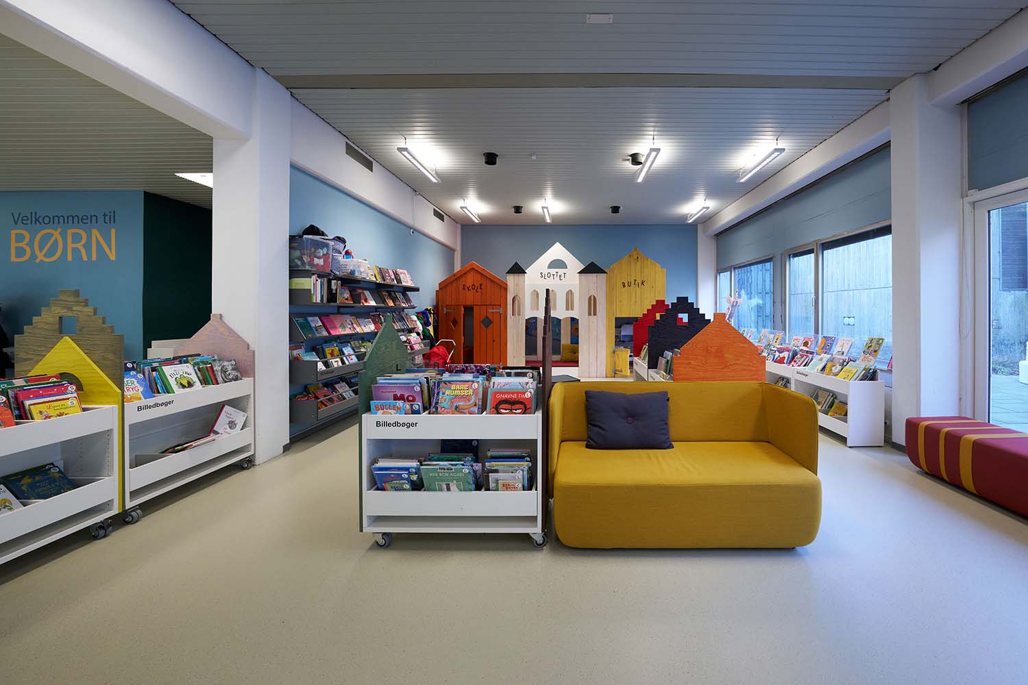 Som hyldest til den maleriske kystby, er den nye børneafdeling på Sæby Bibliotek blevet indrettet til at afspejle det lokale område. Mange specialfremstillede elementer er blevet tilføjet, blandt andet butikker, et teater og en tankstation.