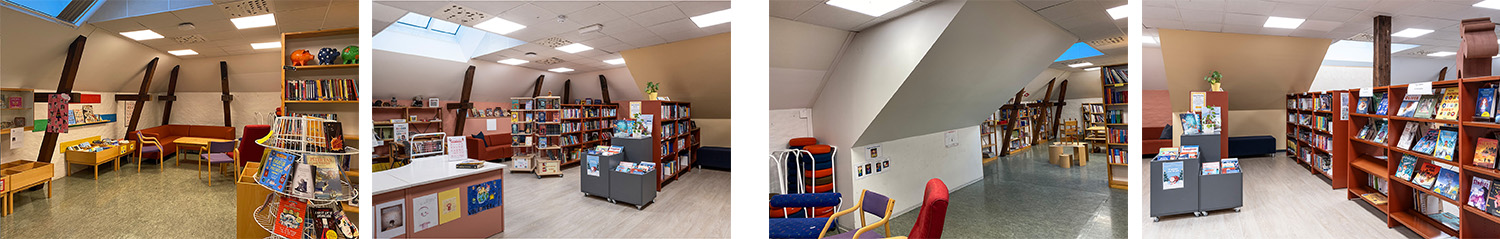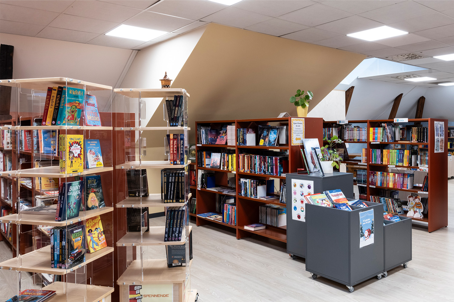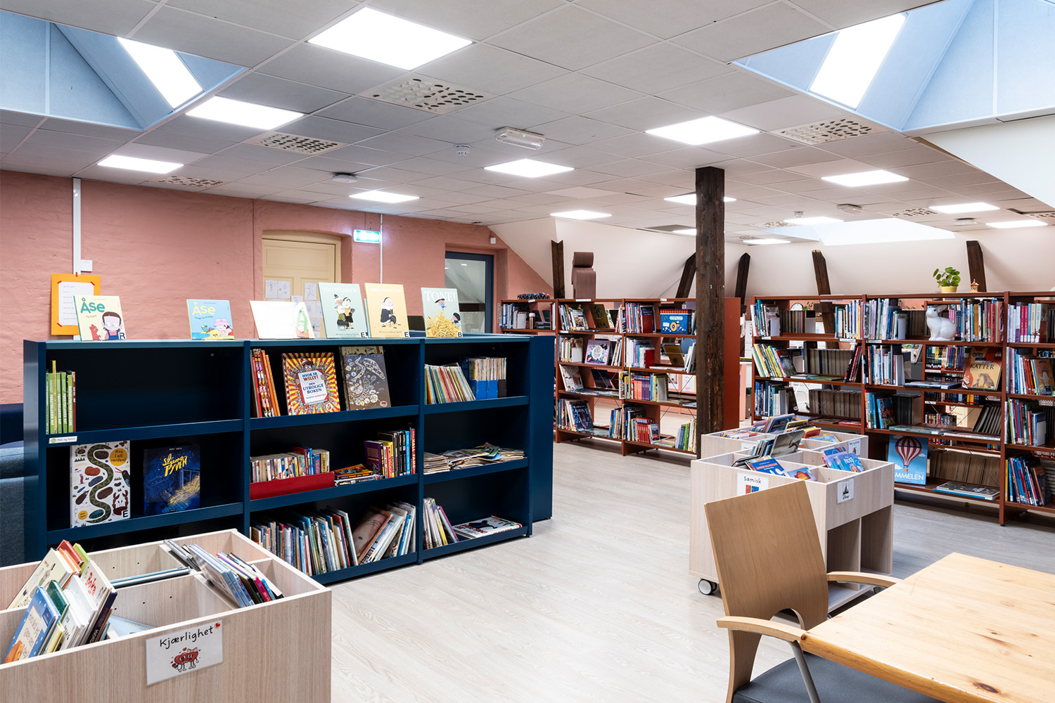 Placeringen på 4. sal, med skrålofter og synlige træbjælker, kombineret med varme farver på vægge og reoler, giver en lun og behagelig stemning i rummet.