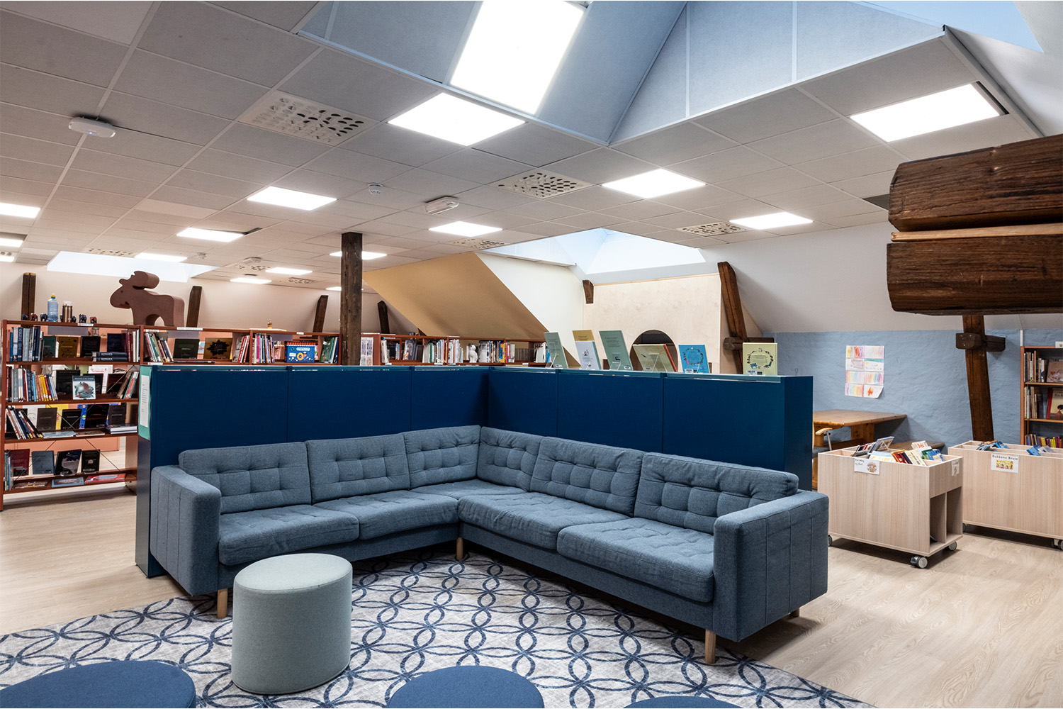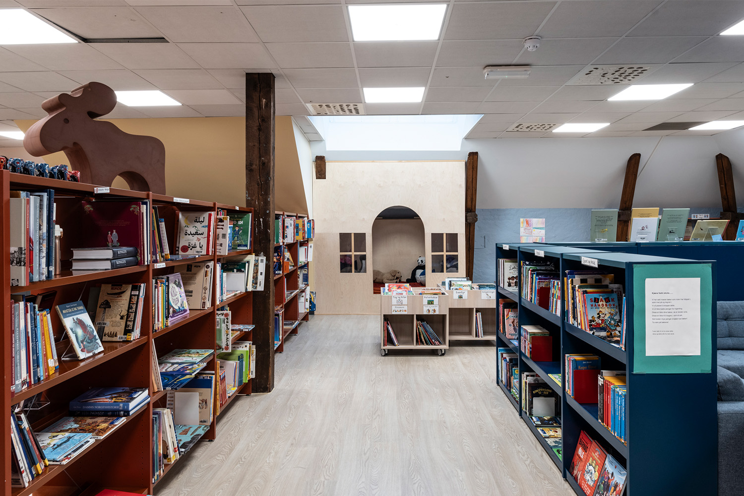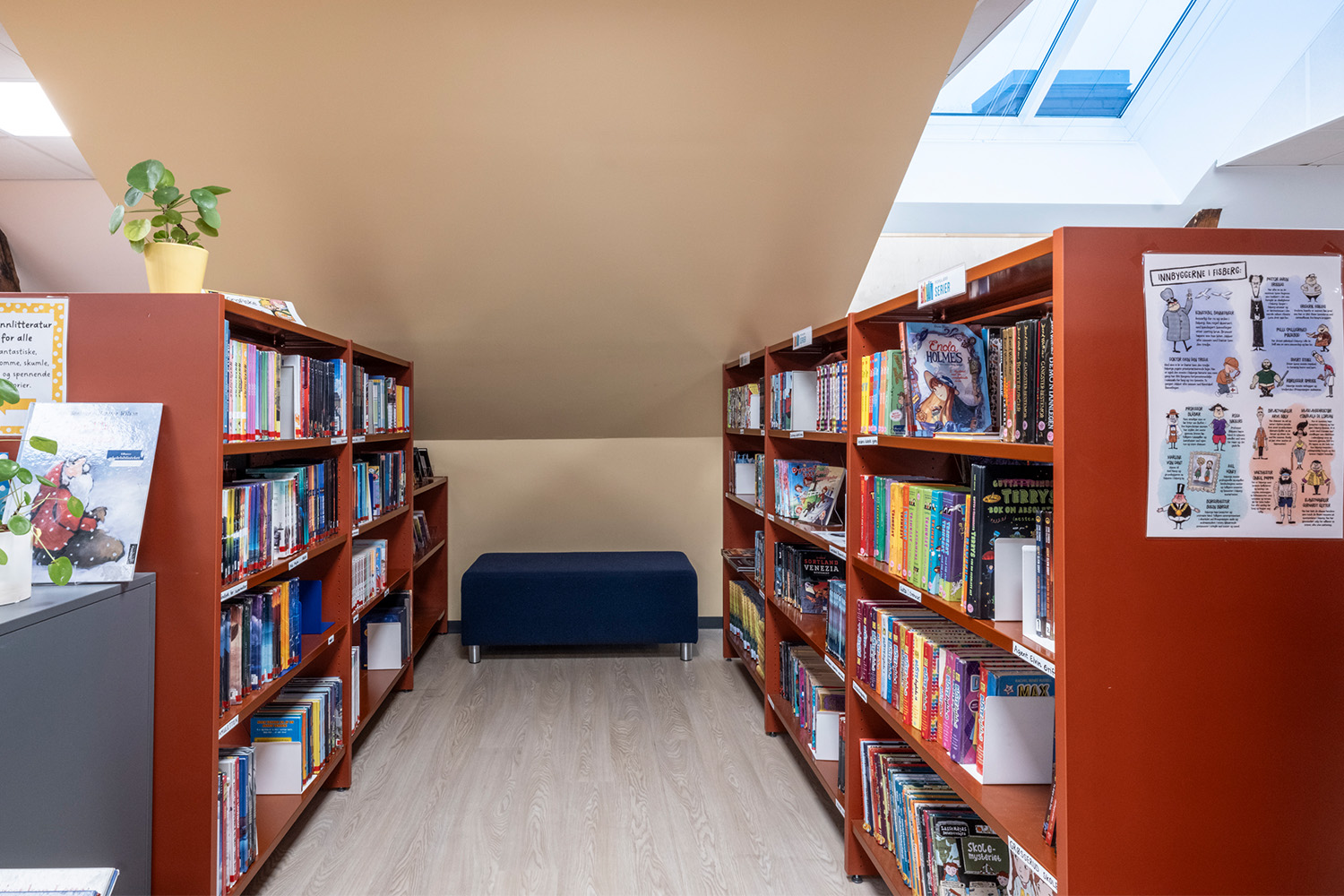 Placeringen på 4. sal, med skrålofter og synlige træbjælker, kombineret med varme farver på vægge og reoler, giver en lun og behagelig stemning i rummet.