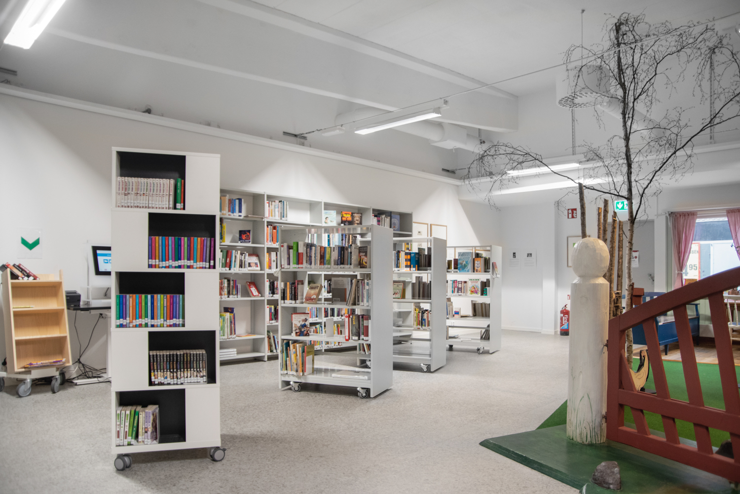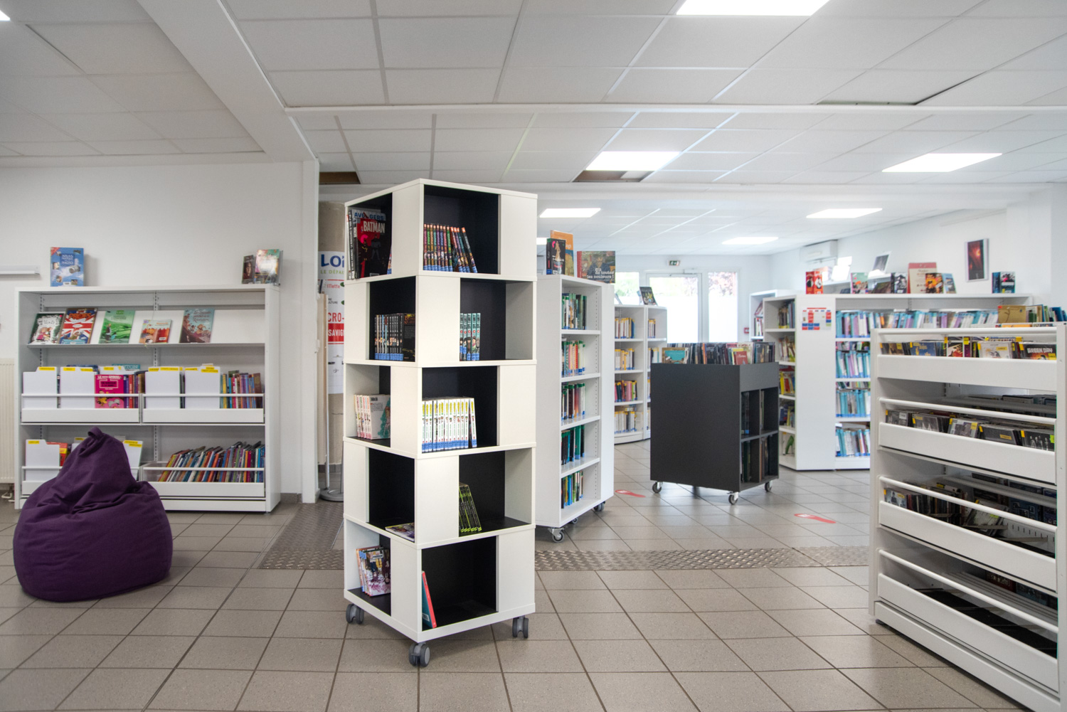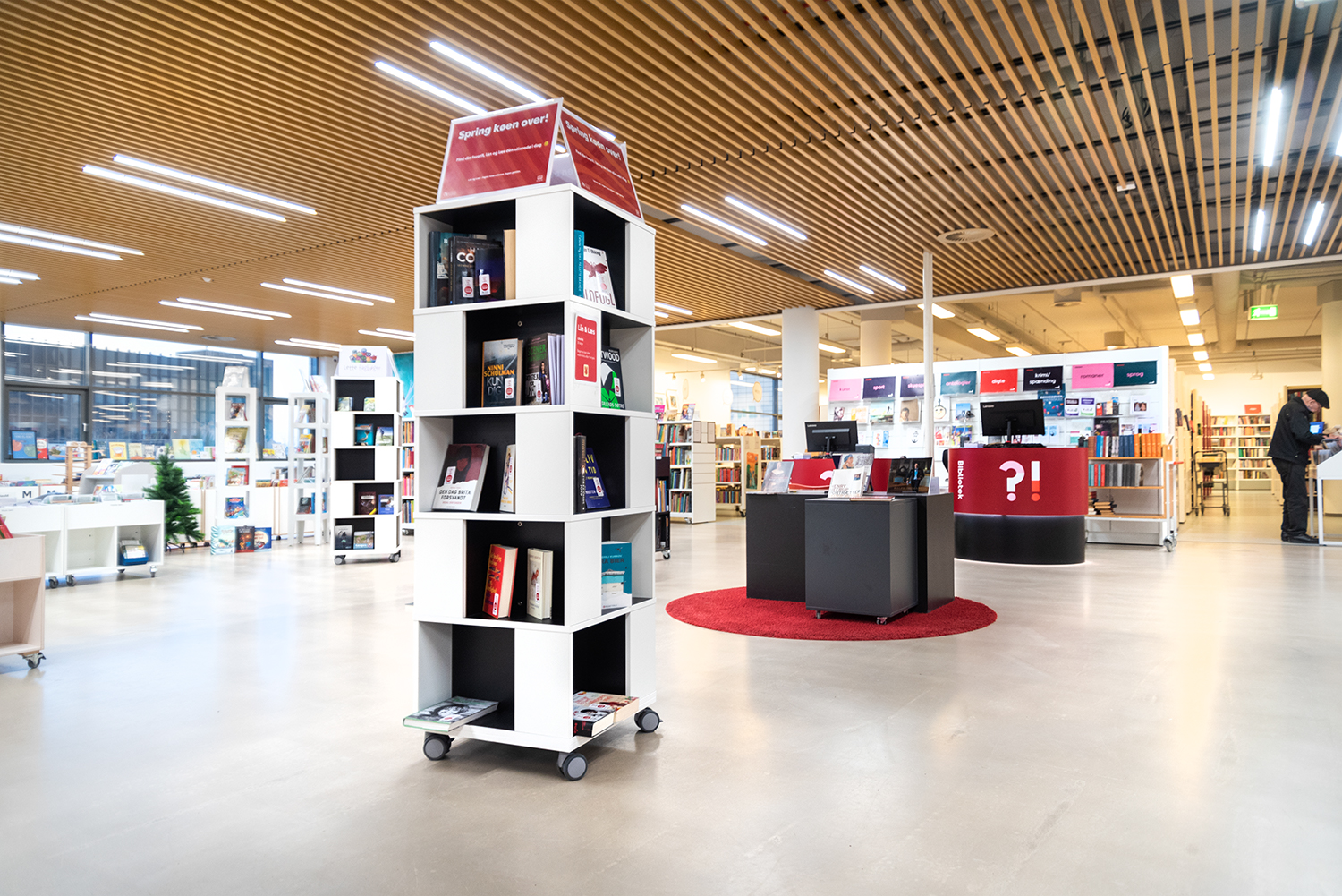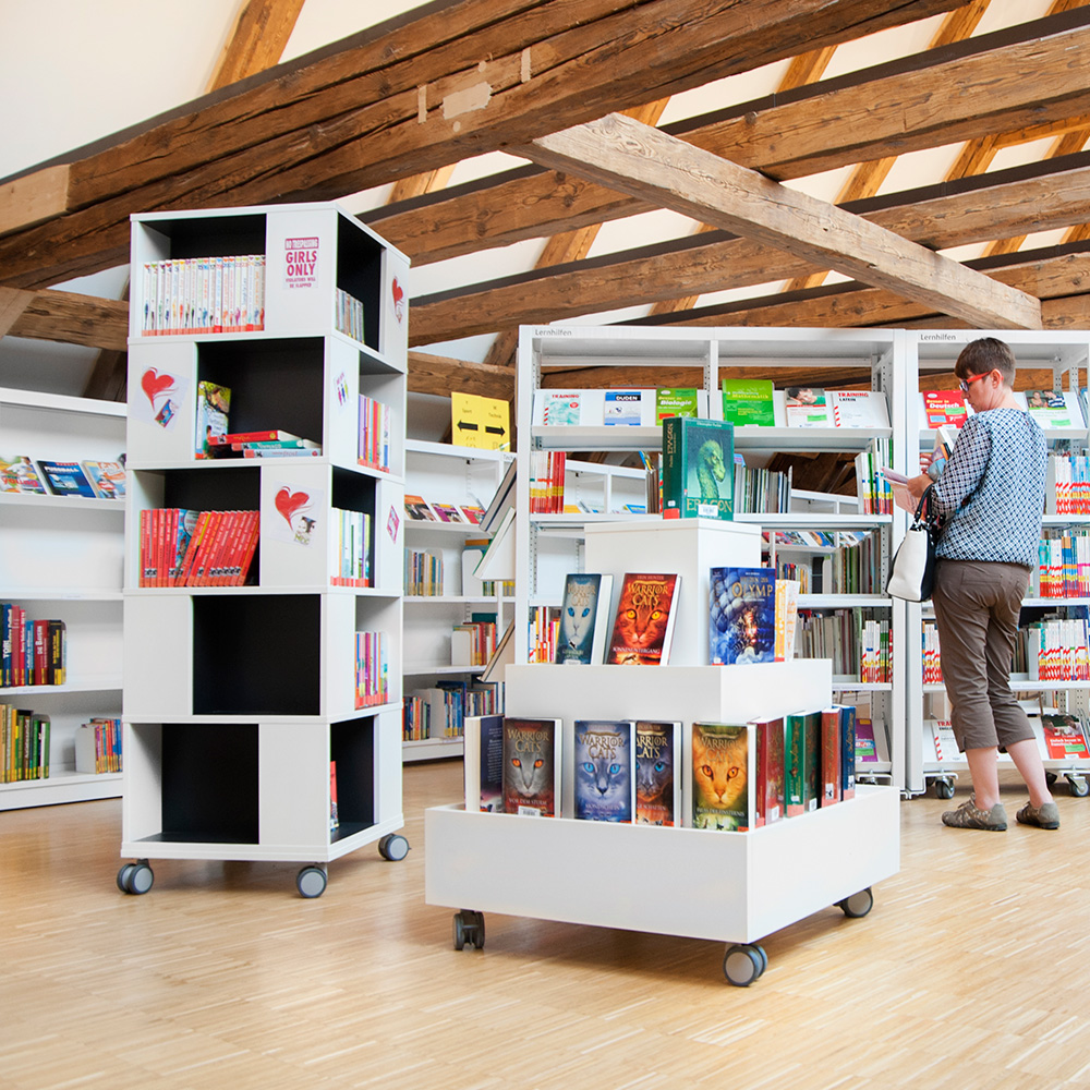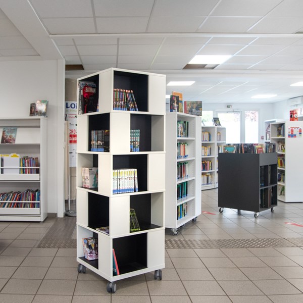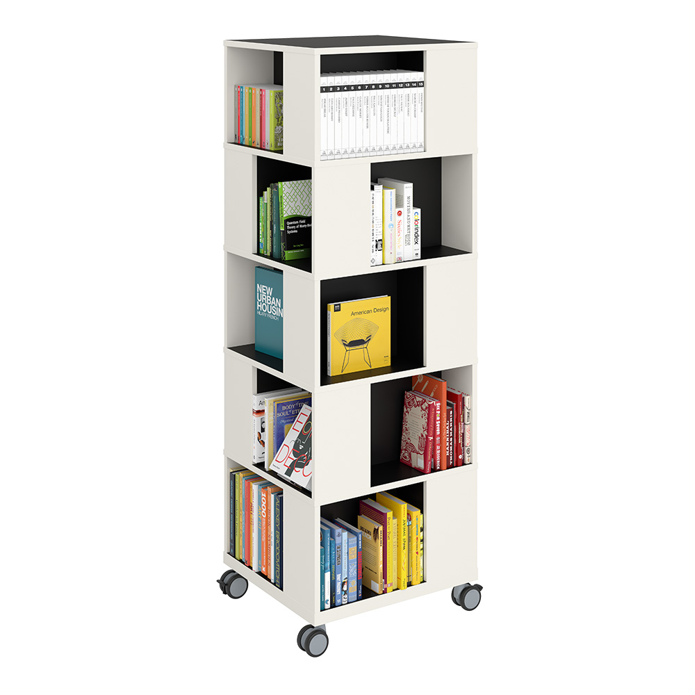 Fritstående, mobilt bogtårn. Stor kapacitet med 4 rum på hvert niveau.