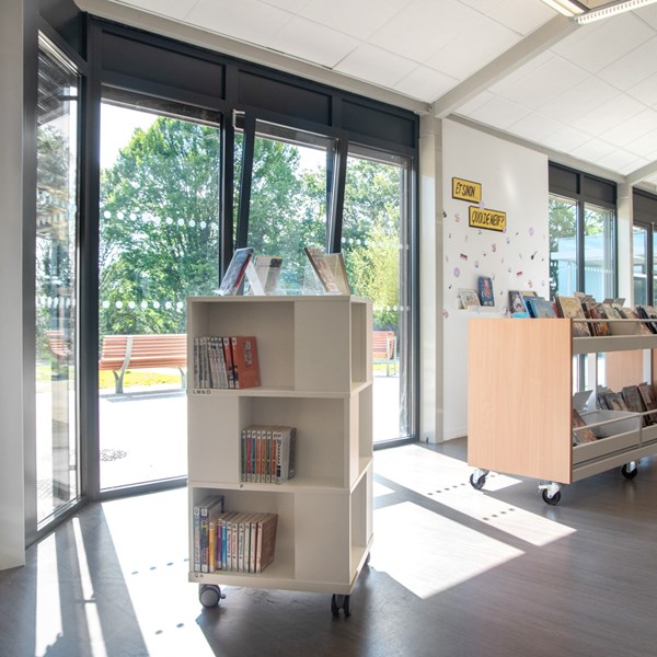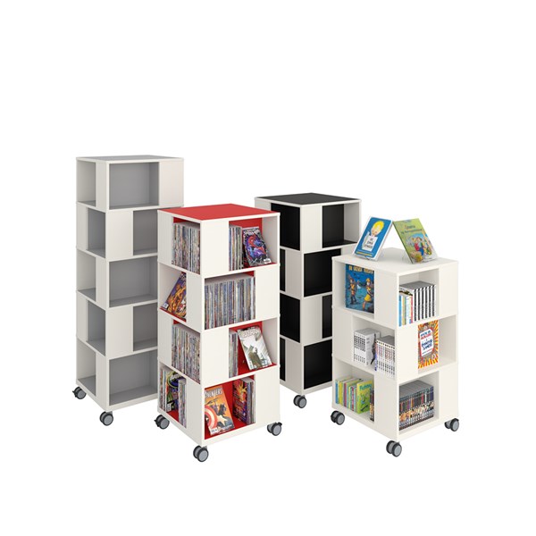 Fritstående, mobilt bogtårn. Stor kapacitet med 4 rum på hvert niveau.