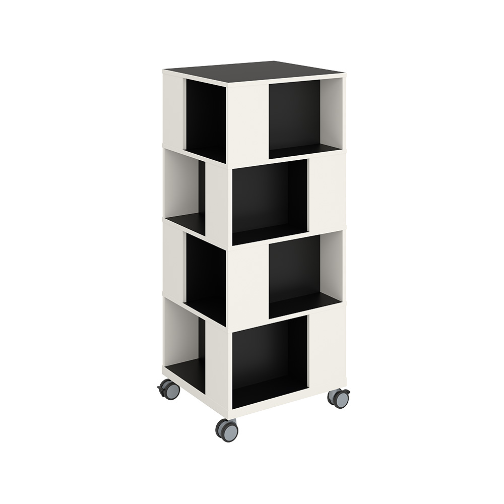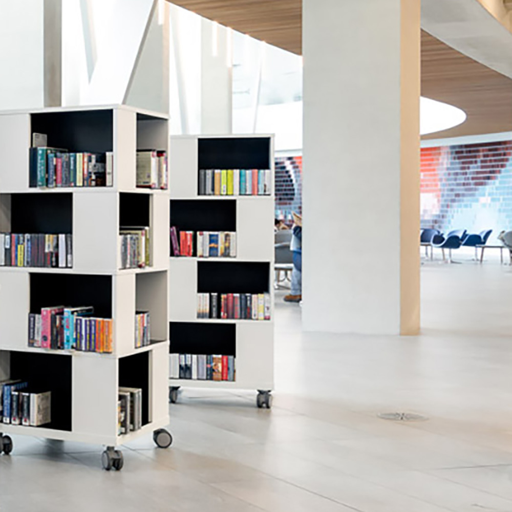 Fritstående, mobilt bogtårn. Stor kapacitet med 4 rum på hvert niveau.