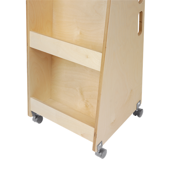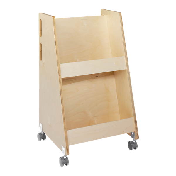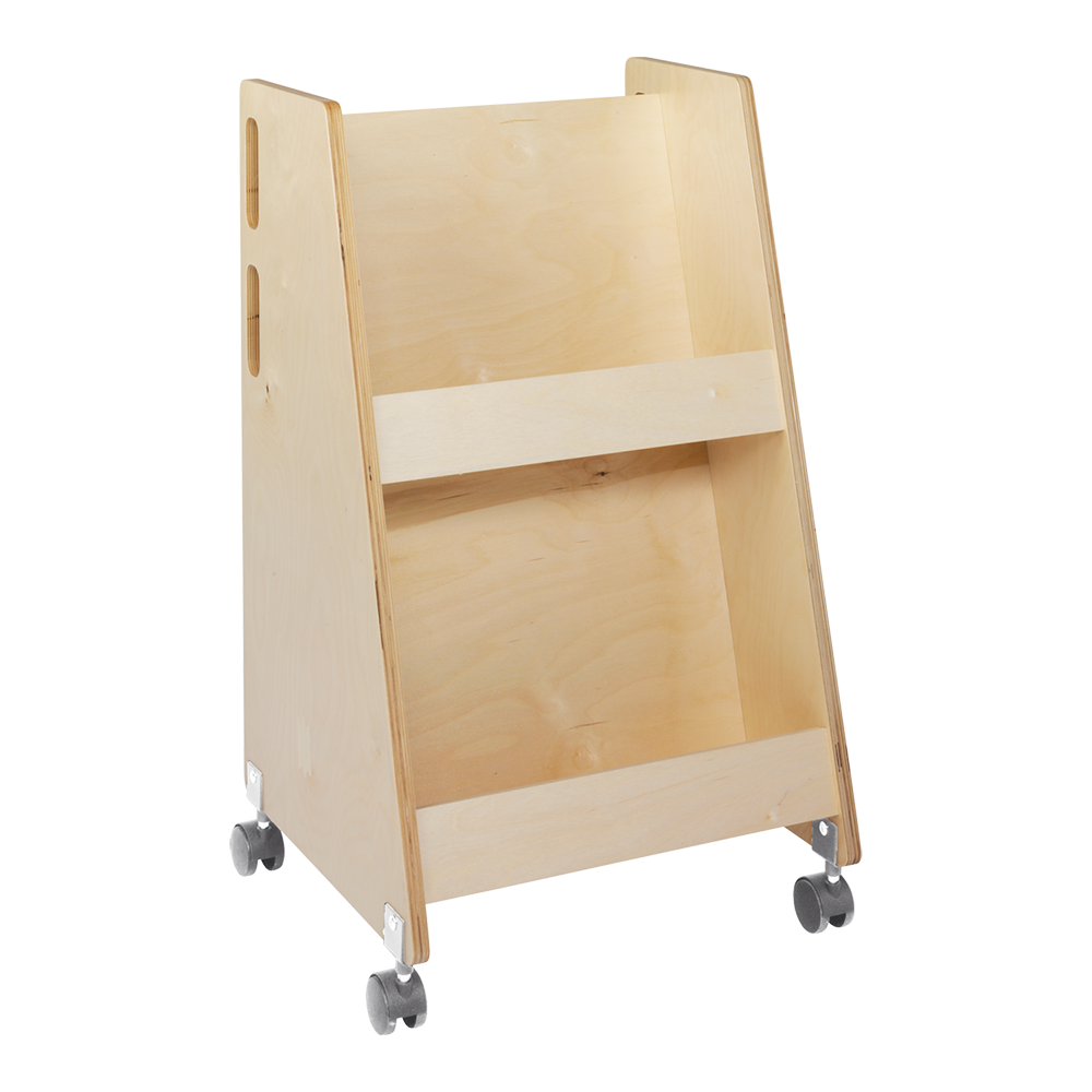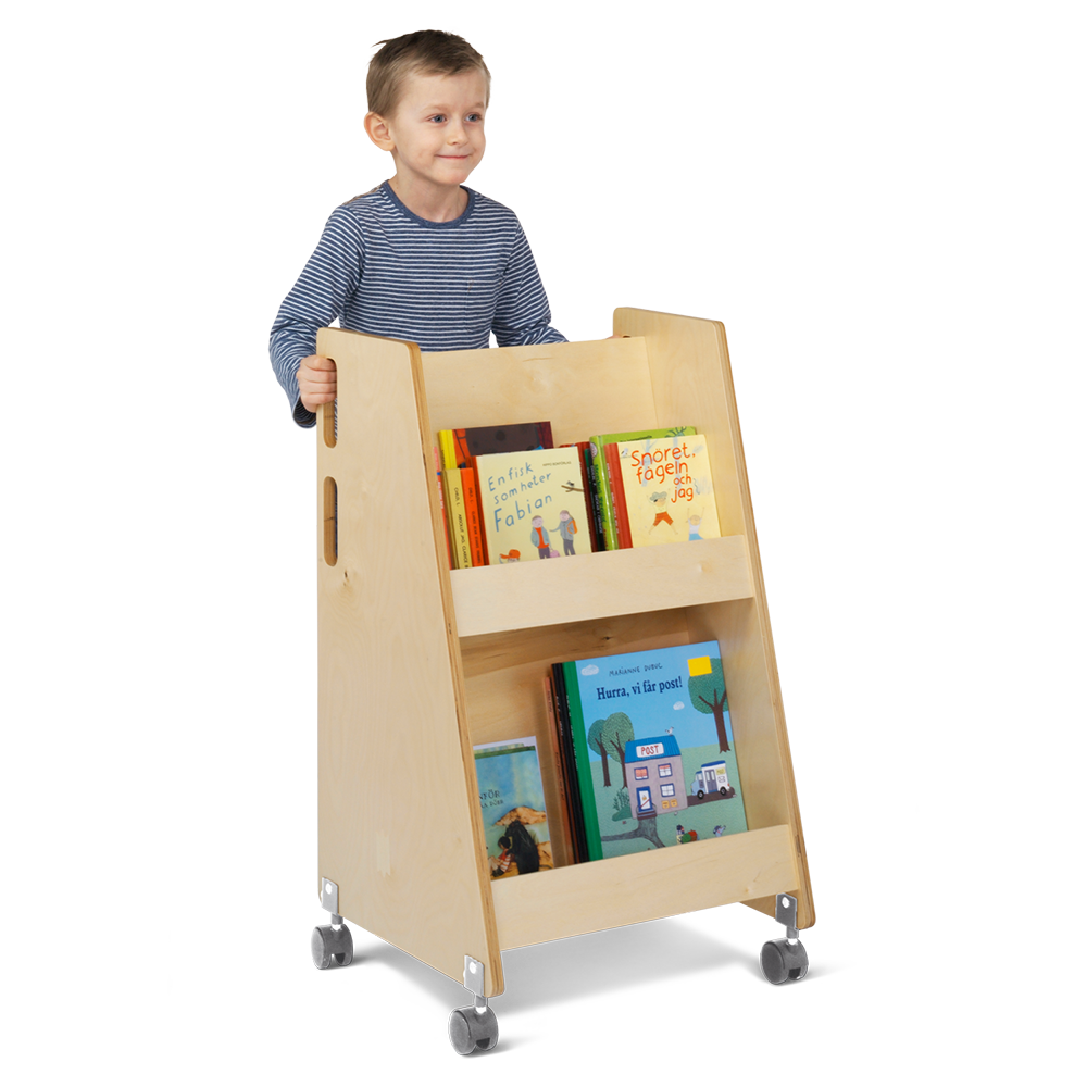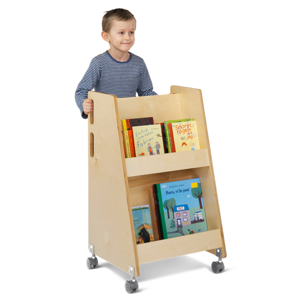 Flot bogvogn i birkefiner med 2 faste hylder med forkantliste til frontudstilling af f.eks. billedbøger.