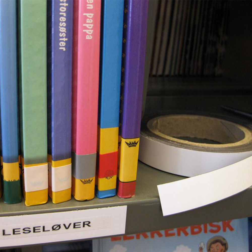 Tydelig, letanvendelig og praktisk mærkning til f.eks. hylder, gavle eller bogstøtte med forkant i stål.