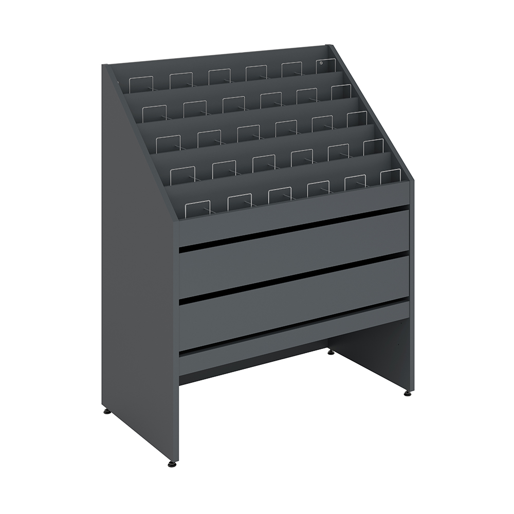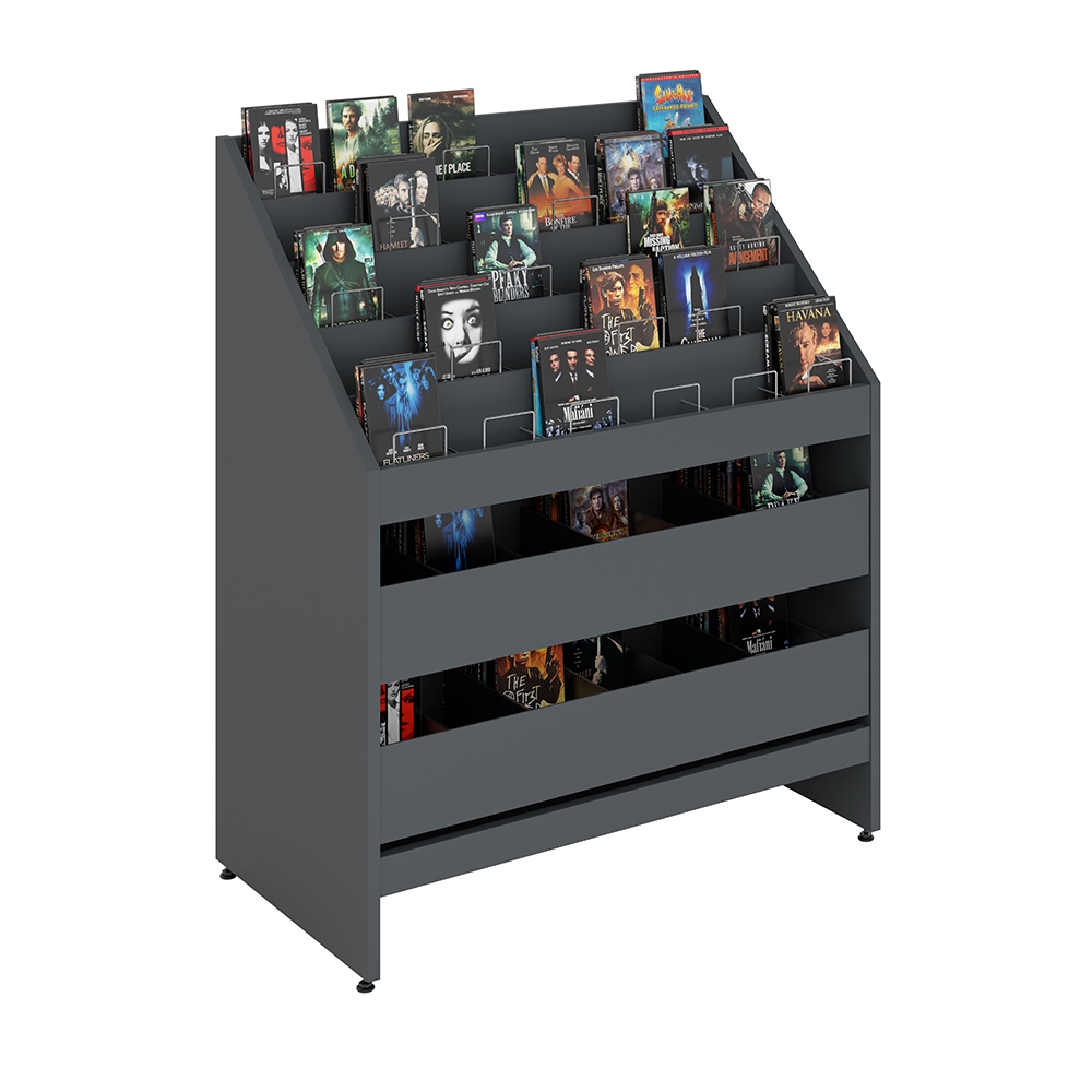 Krybben har 5 etager, hver opdelt i 6 rummelige fag til CD'er og DVD'er.