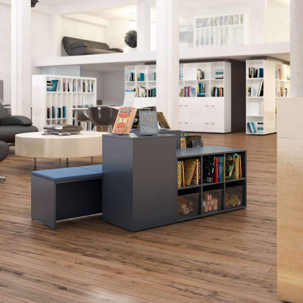 Velegnet til at skabe små og store øer i biblioteket. Den simple form passer godt ind i de fleste miljøer og sætter fokus på bøgerne.