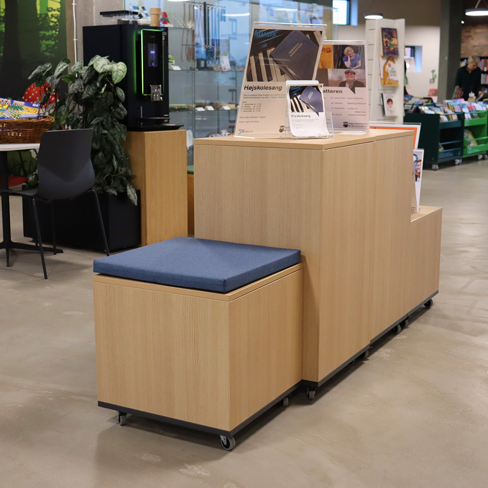 Velegnet til at skabe små og store øer i biblioteket. Den simple form passer godt ind i de fleste miljøer og sætter fokus på bøgerne.