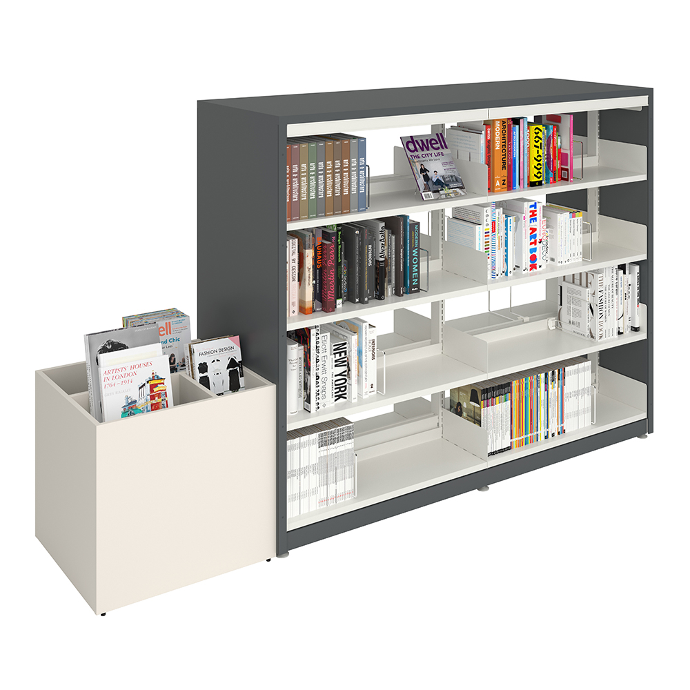 Velegnet til at skabe små og store øer i biblioteket. Den simple form passer godt ind i de fleste miljøer og sætter fokus på bøgerne.