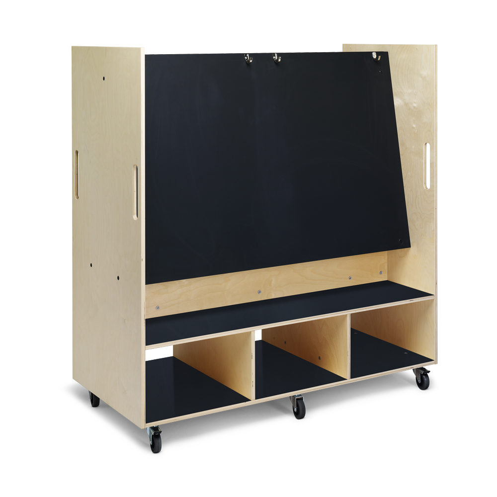 Skråtstillet maleflade i sort laminat med skrive-/magnetfunktion, holder til flip-over blok samt praktisk hylde til frasætning af alle de ting, som er nødvendige at have ved hånden såsom kridt, pensler og farver. Dertil kommer rigelig opbevaringsplads til kunstnermaterialer.