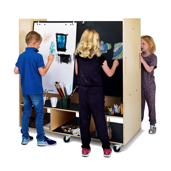 Fritstående, dobbeltsidet staffeli på hjul, hvor op til fire børn kan skabe samtidigt.