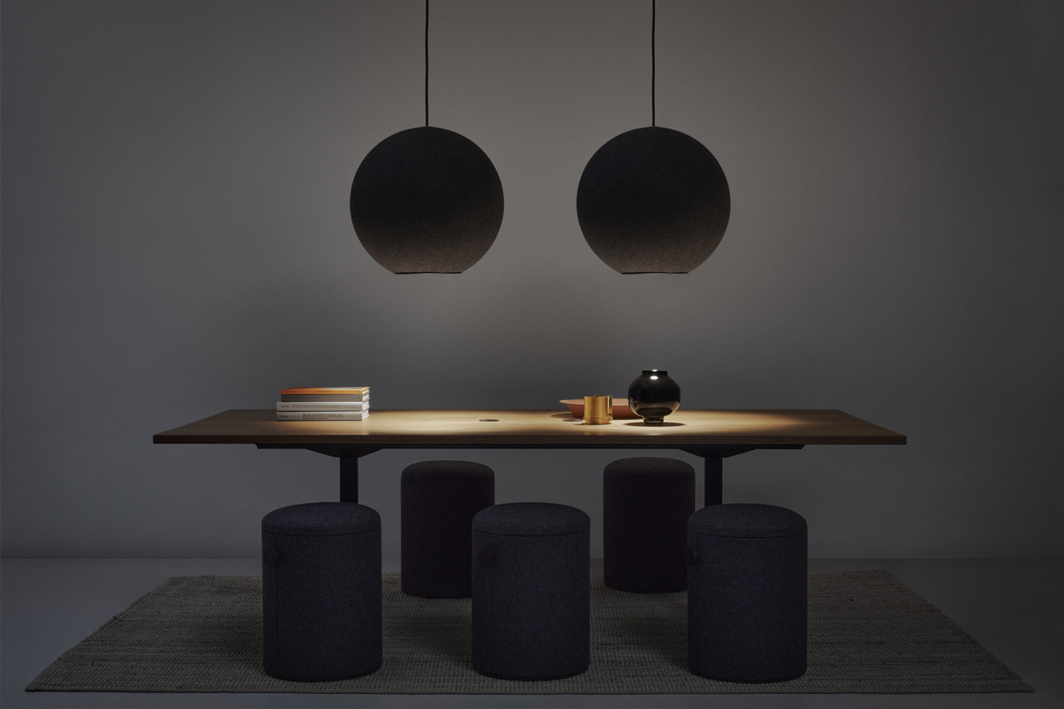 Lampen skaber en harmonisk balance mellem funktionalitet og æstetik og bidrager til en behagelig atmosfære, hvor støjniveauet er dæmpet uden at gå på kompromis med lyskvaliteten. Den runde forms yderside består af polyesterfilt i flere forskellige farver. Under filten er den lydabsorberende kerne lavet i genanvendeligt PET.
