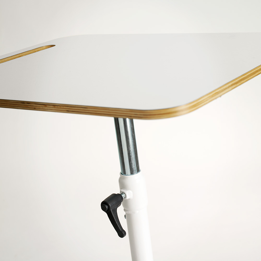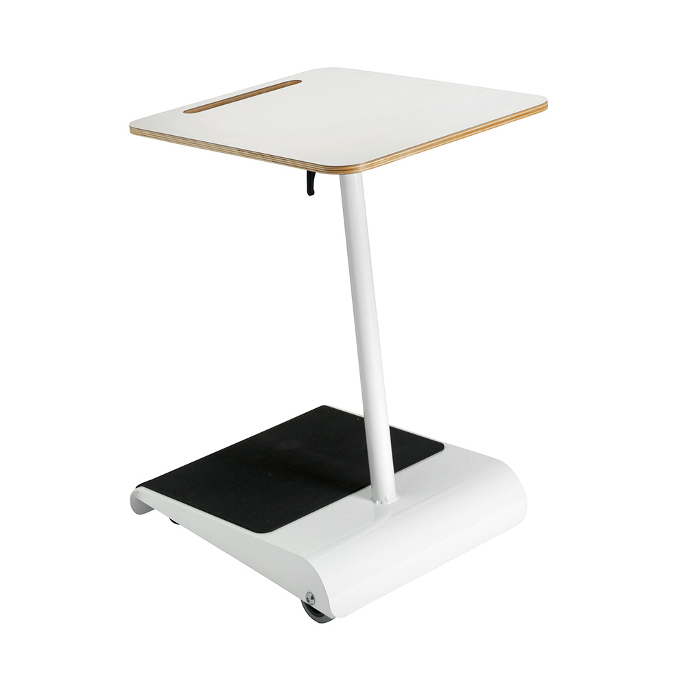 Hjul og det skråtstillede arbejdsbord med håndtag, gør bordet let at flytte. Gummimåtten sikrer behagelig fodstøtte.