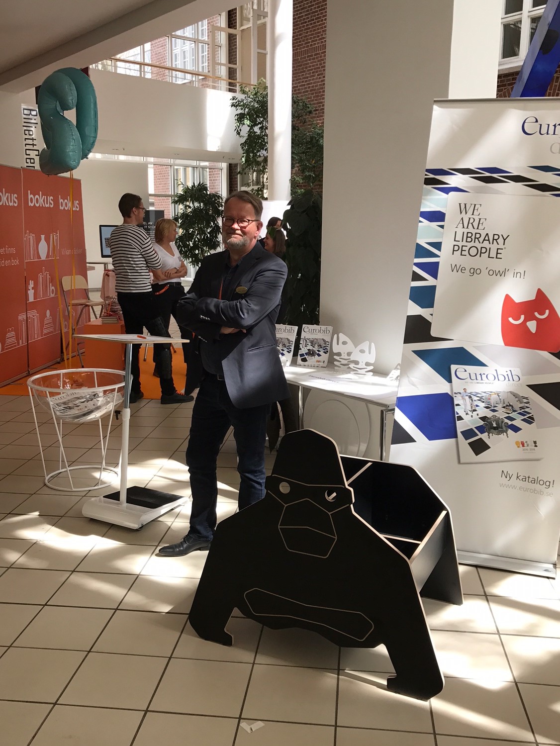 Malin Djupman og Bjarne Hjertvik, Lammhults Biblioteksdesign AB fremviste nogle af de seneste nyheder på standen i udstillingsområdet. Billedbogskrybben Gordon (et rigtigt muskelbundt) i Wildlife-kollektionen blev introduceret sammen med Jumbo podie og Fishy eksponeringsholder. Figurativt, iøjnefaldende og med glimt i øjet.