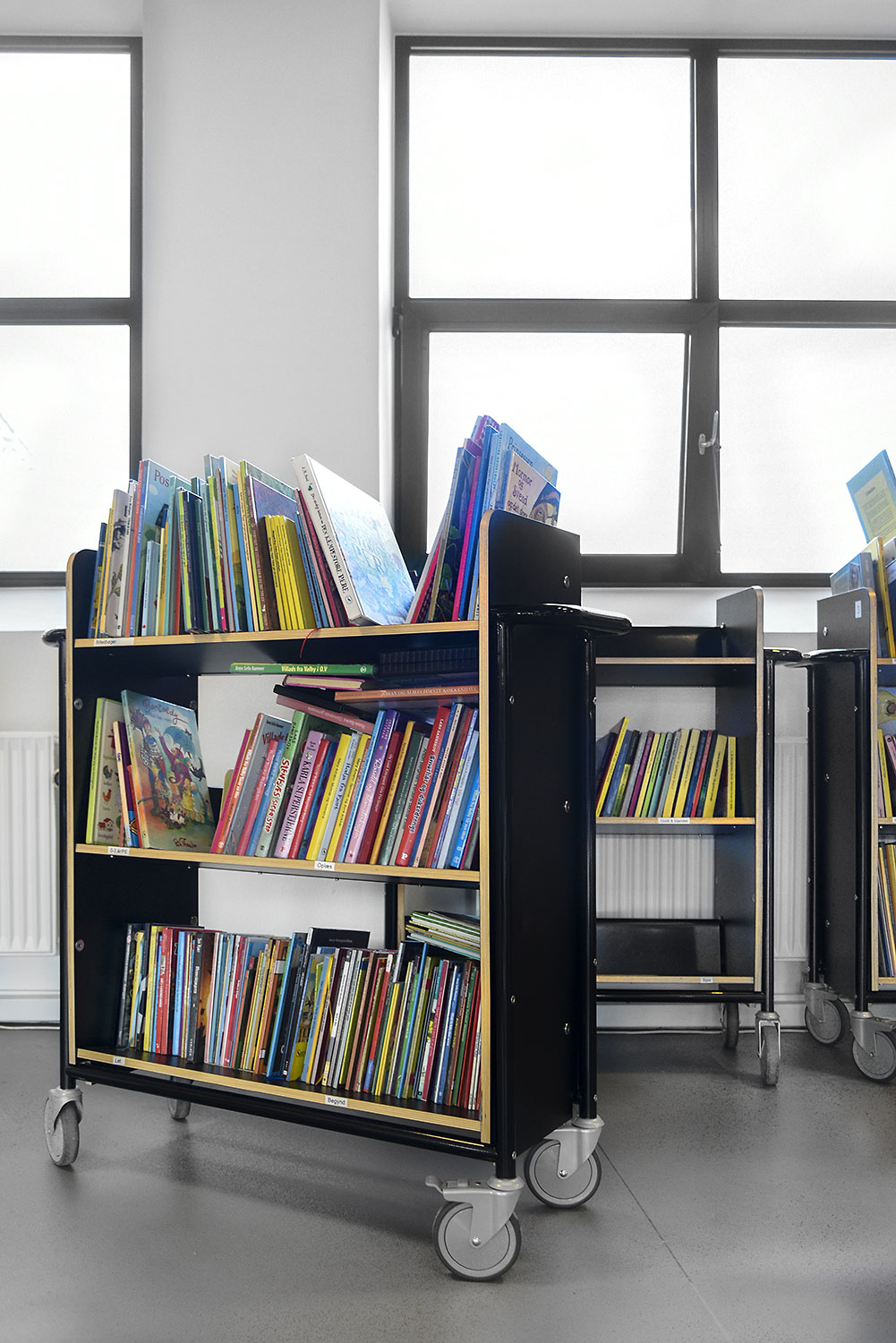 Funktionel, enkeltsidet vogn med 3 faste bagudvippede hylder, som sikrer stabil opbevaring. Vognen er rummelig, både hvad angår dybden og afstanden mellem hylderne og kan bruges både til alle størrelser bøger og ringbind.
