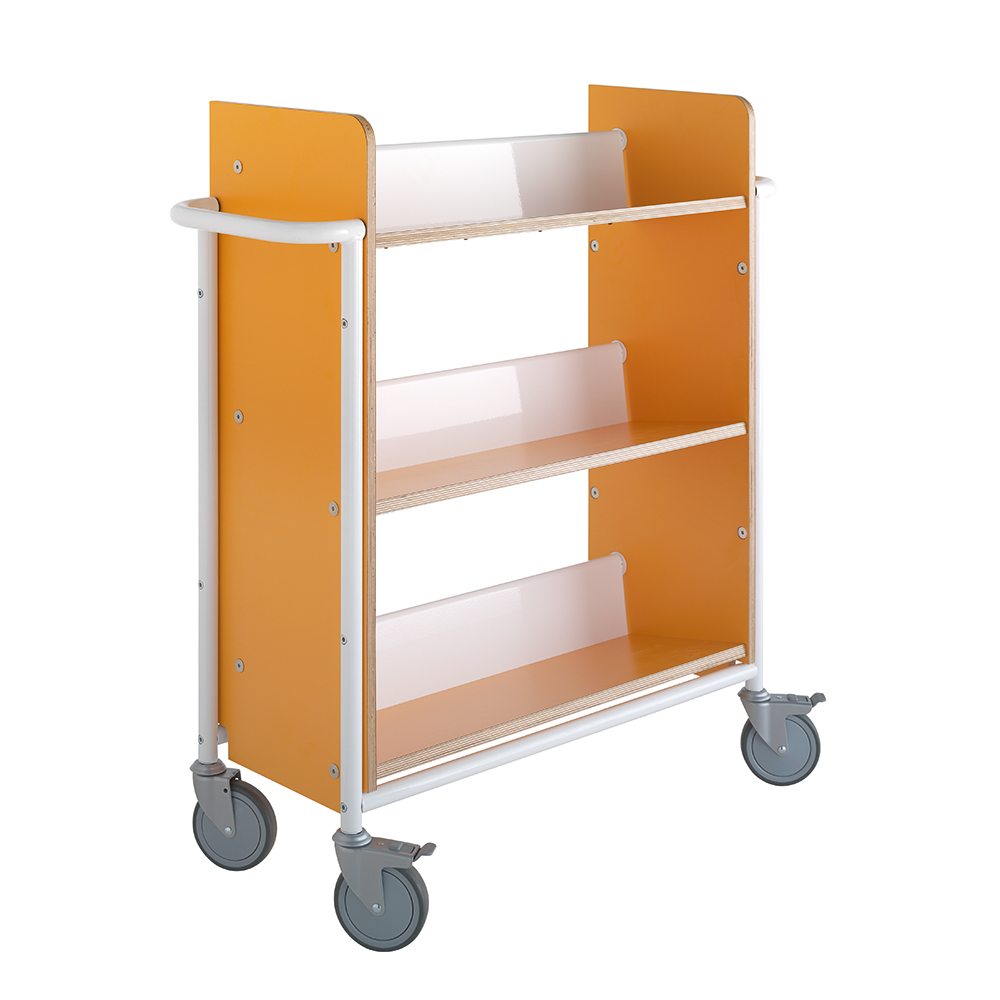 Funktionel, enkeltsidet vogn med 3 faste bagudvippede hylder, som sikrer stabil opbevaring. Vognen er rummelig, både hvad angår dybden og afstanden mellem hylderne og kan bruges både til alle størrelser bøger og ringbind.