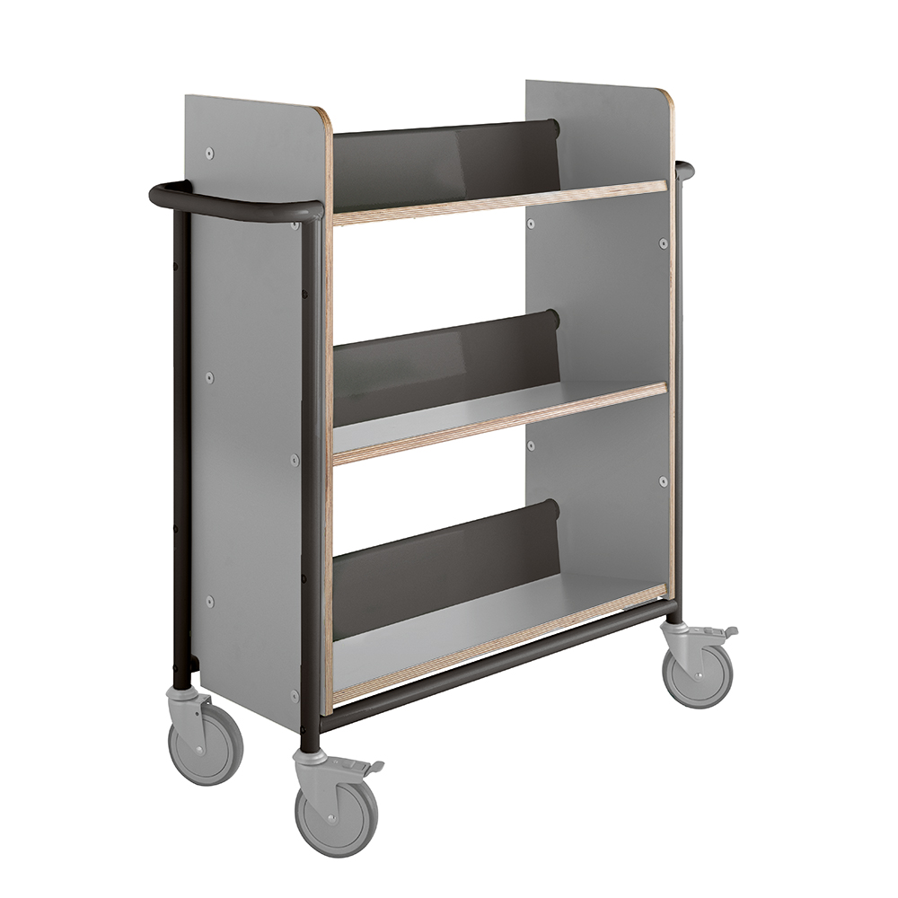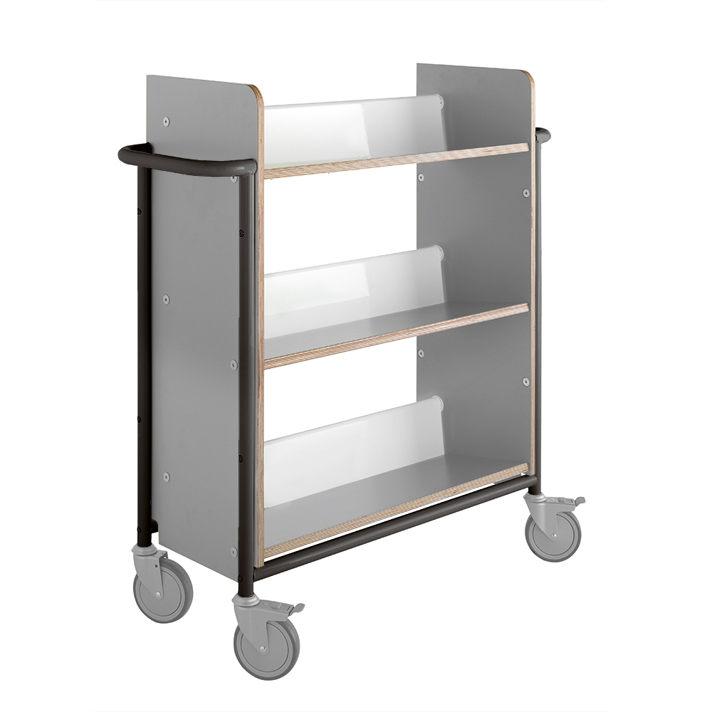Funktionel, enkeltsidet vogn med 3 faste bagudvippede hylder, som sikrer stabil opbevaring. Vognen er rummelig, både hvad angår dybden og afstanden mellem hylderne og kan bruges både til alle størrelser bøger og ringbind.
